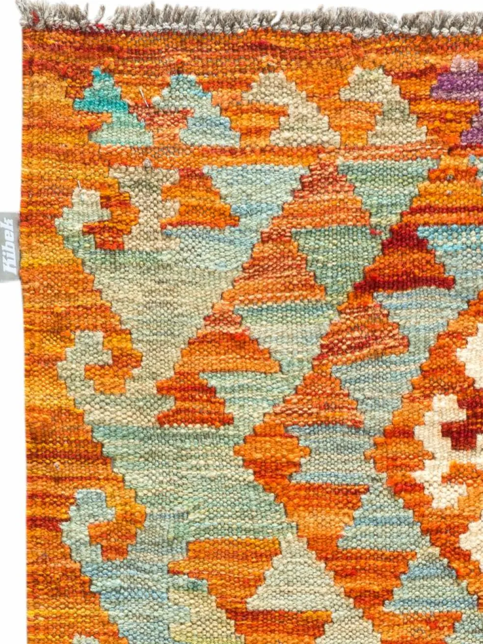 gehört zu den Schlitzkelims. Beim Schlitzkelim entsteht das Muster durch das farbige Schussmaterial, das bei einem Farbwechsel wieder zurück geführt wird. Dadurch entsteht ein sichtbarer Schlitz. Die Fadenenden werden eingearbeitet und sind nicht zu sehen. Durch diese Webart ist der AfghanKelim