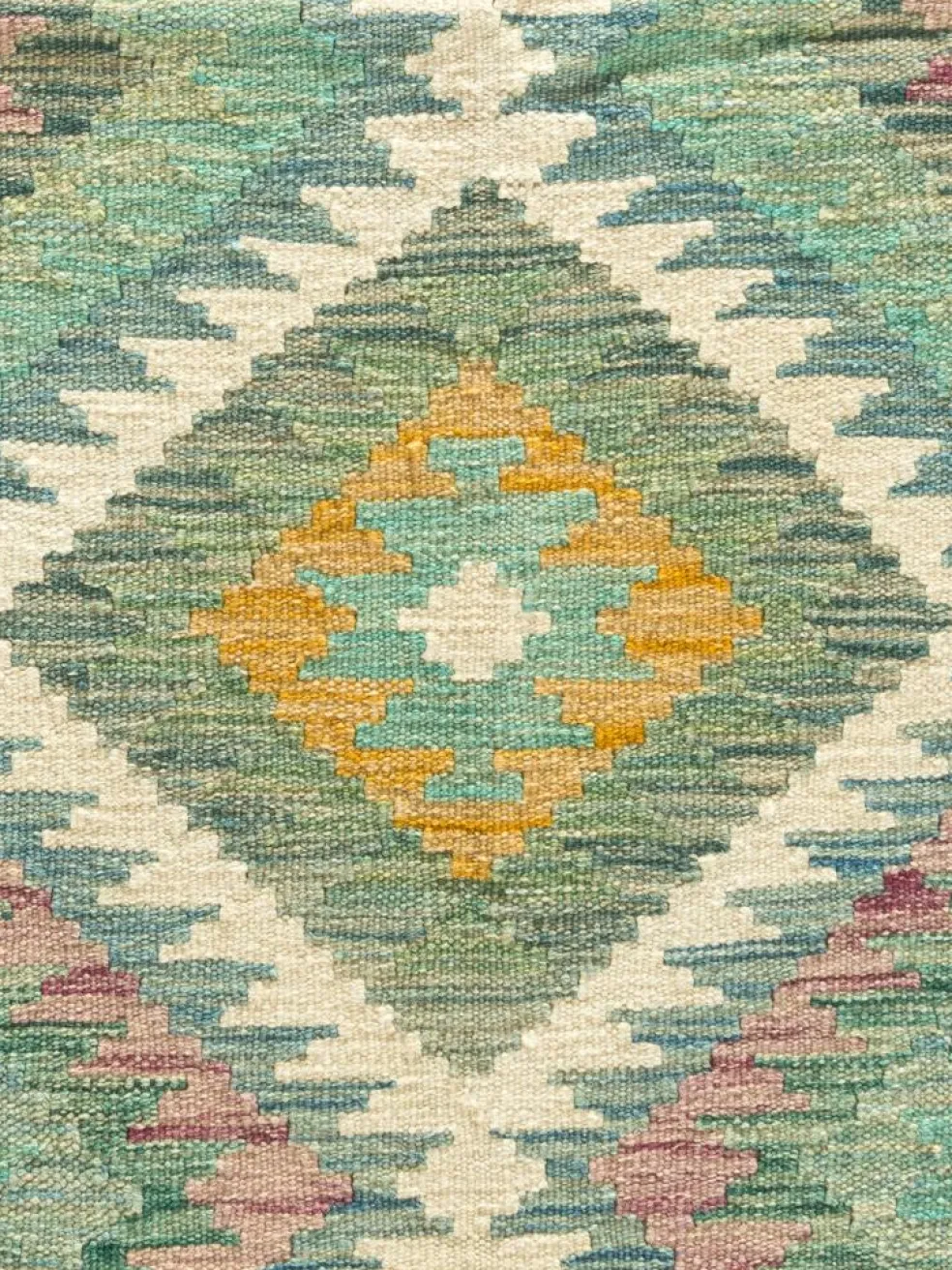 gehört zu den Schlitzkelims. Beim Schlitzkelim entsteht das Muster durch das farbige Schussmaterial, das bei einem Farbwechsel wieder zurück geführt wird. Dadurch entsteht ein sichtbarer Schlitz. Die Fadenenden werden eingearbeitet und sind nicht zu sehen. Durch diese Webart ist der AfghanKelim