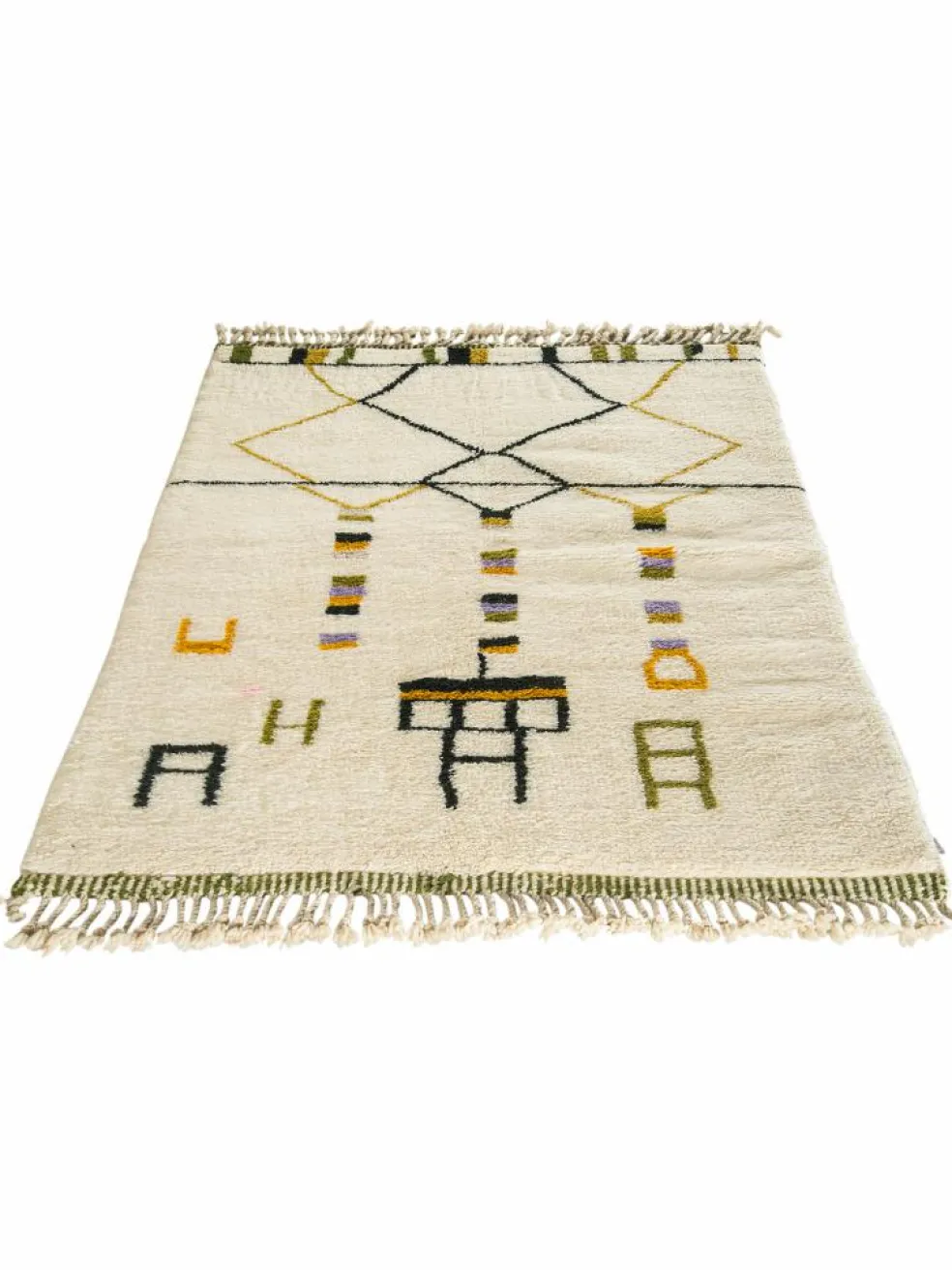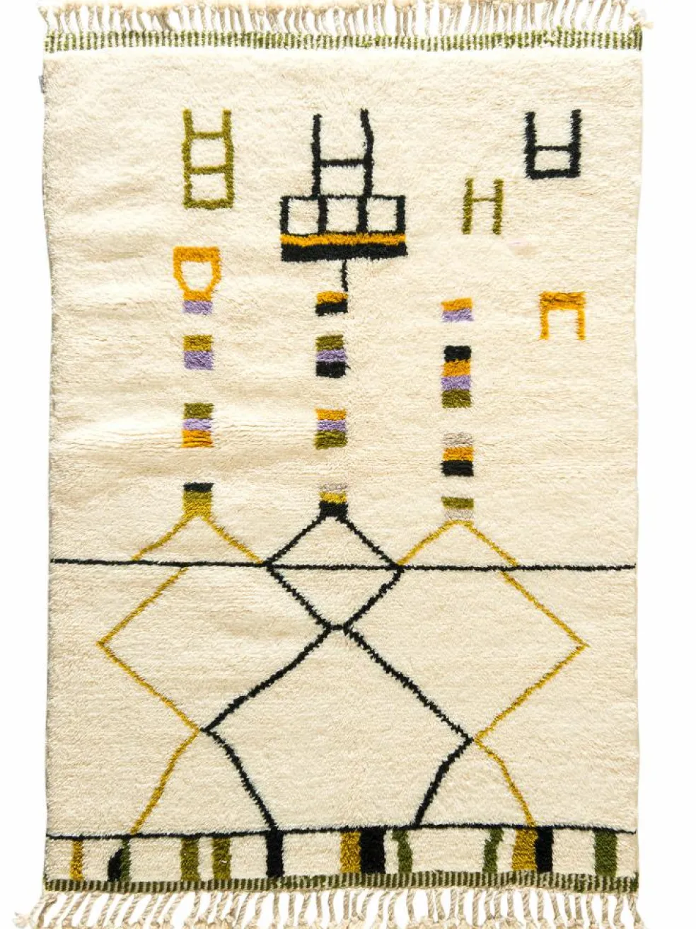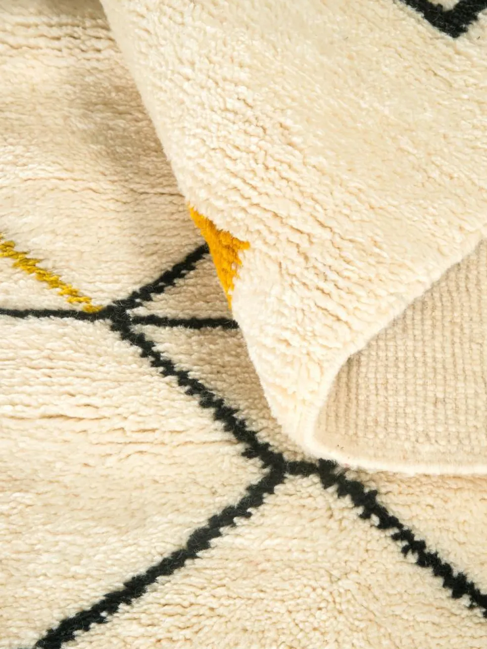 . Die Teppiche sind fast immer weißgrundig und zeichnen sich durch schwarze Zickzack-, Gitter- oder Rauten-Muster sowie einem wohnlich-zotteligen Flor aus. Kaum eine andere Teppichprovenienz passt mit ihren ursprünglichen nomadischen Designs besser in einen minimalistischen Wohnstil. Wie viele andere Nomadenteppiche auch, wurden dieBeni Ourain