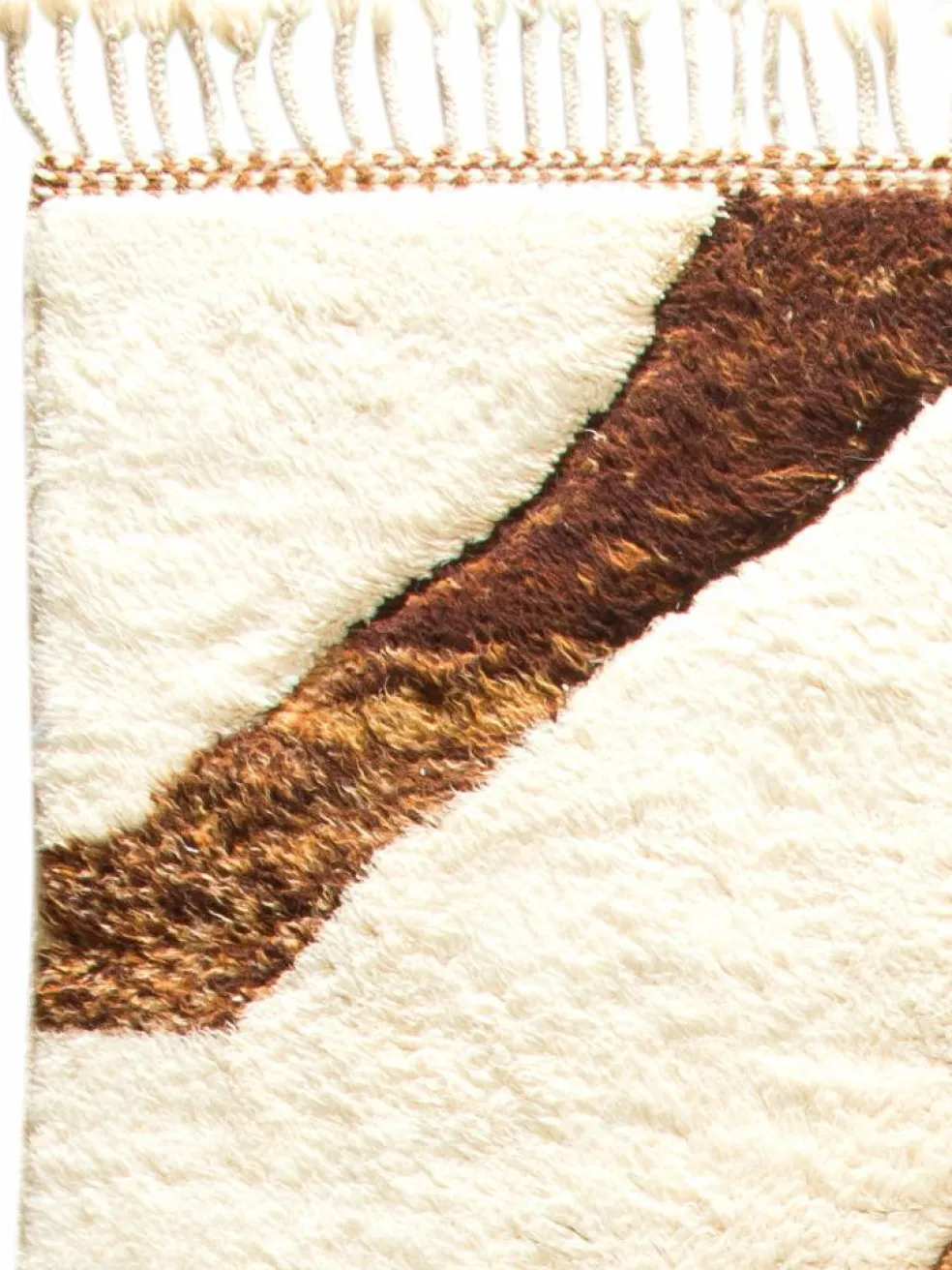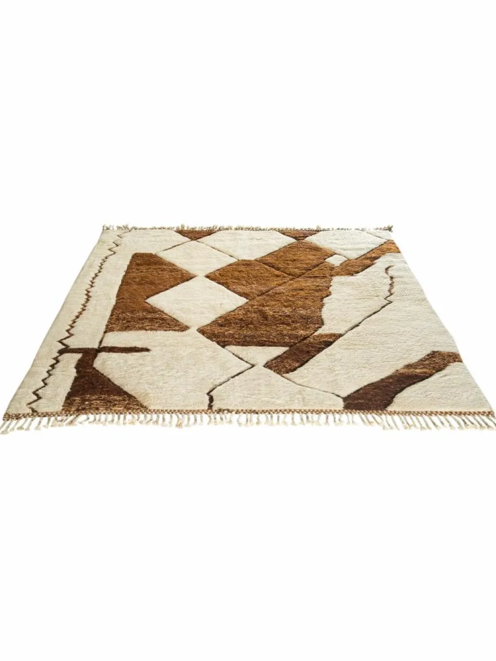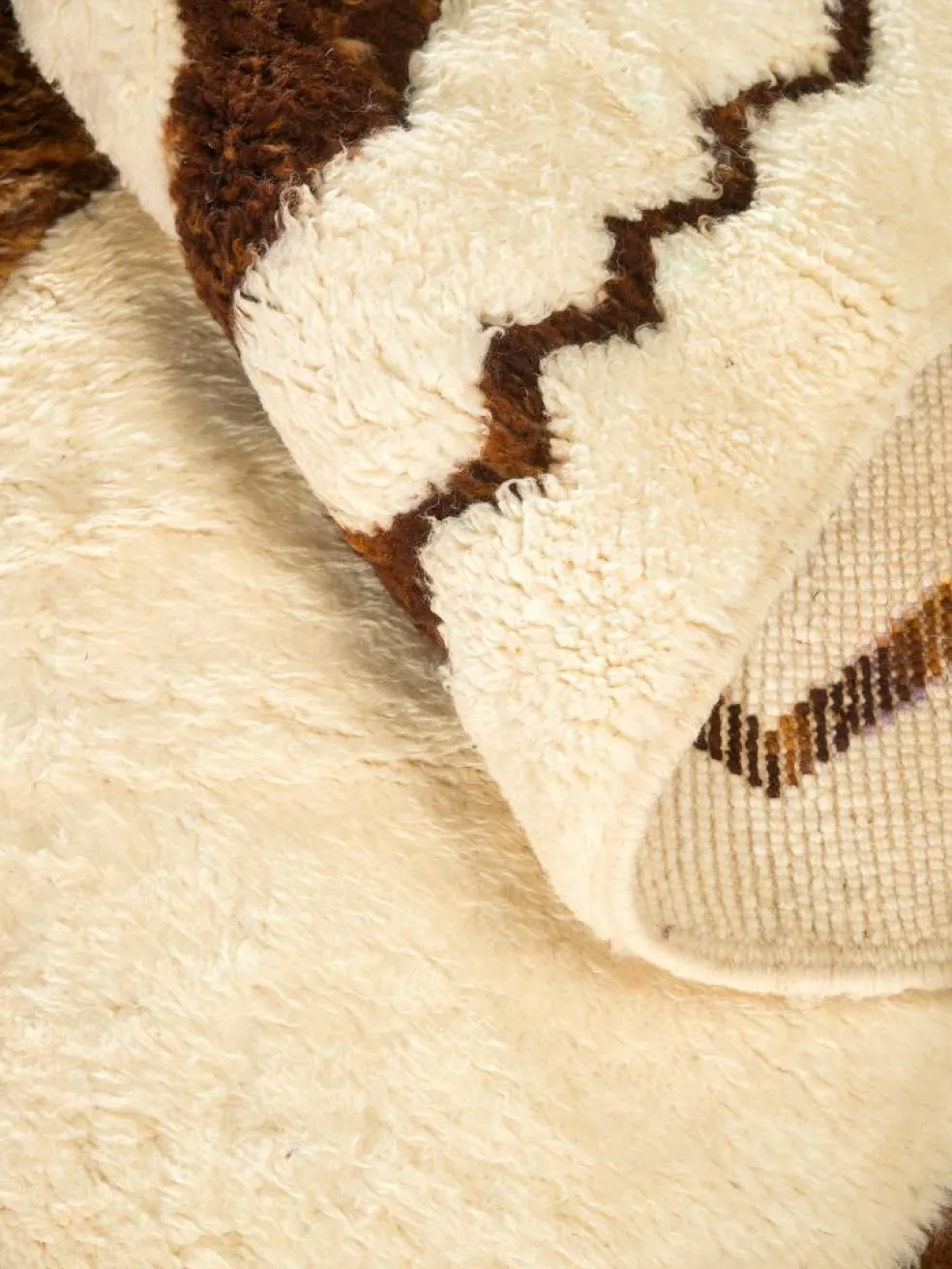 . Die Teppiche sind fast immer weißgrundig und zeichnen sich durch schwarze Zickzack-, Gitter- oder Rauten-Muster sowie einem wohnlich-zotteligen Flor aus. Kaum eine andere Teppichprovenienz passt mit ihren ursprünglichen nomadischen Designs besser in einen minimalistischen Wohnstil. Wie viele andere Nomadenteppiche auch, wurden dieBeni Ourain