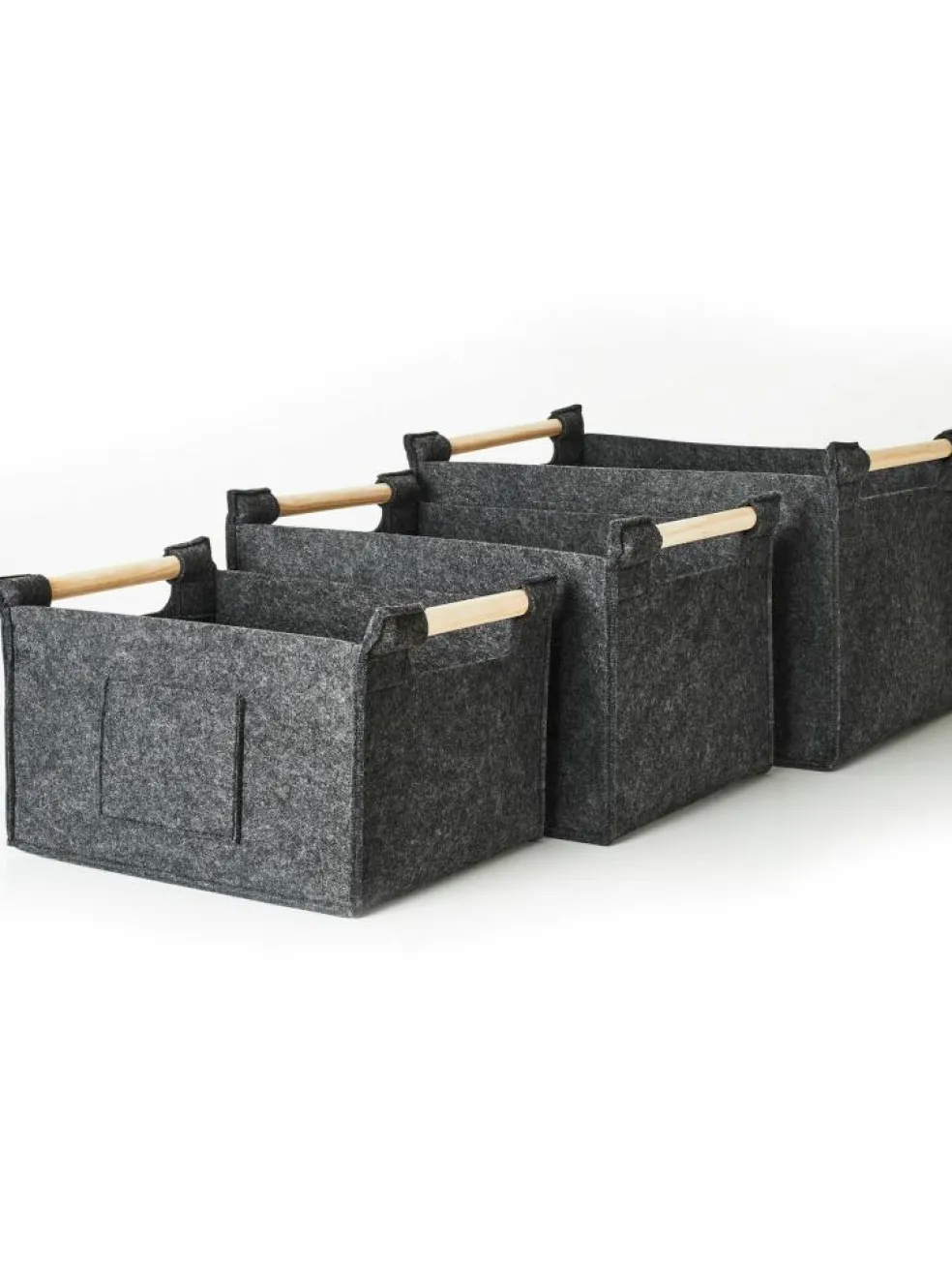 Feste Filzstoffbahnen werden professionell zugeschnitten und miteinander vernäht. Massivholzgriffe sorgen für den sicheren Halt und Transport.