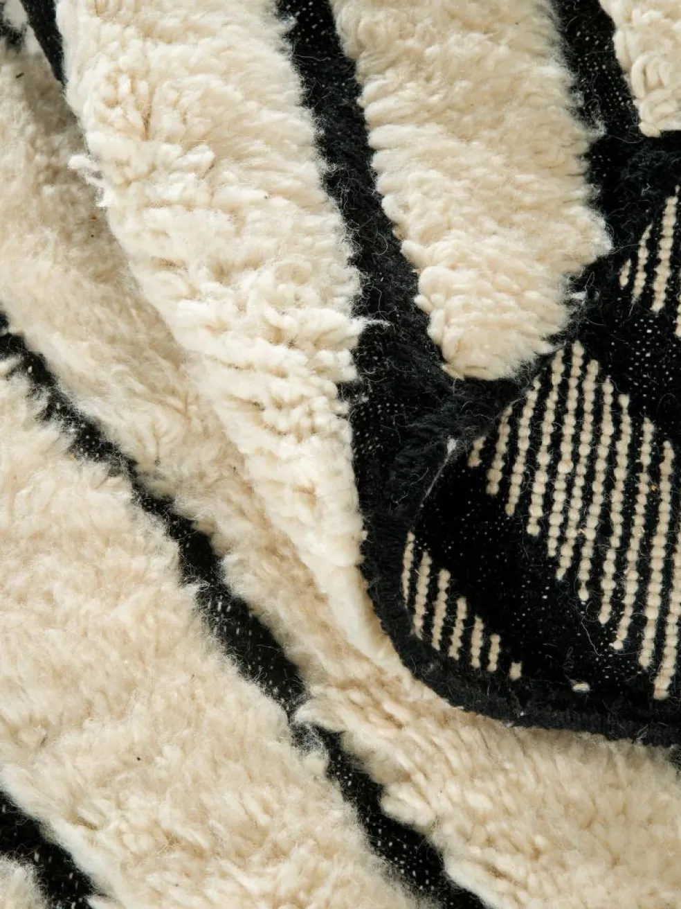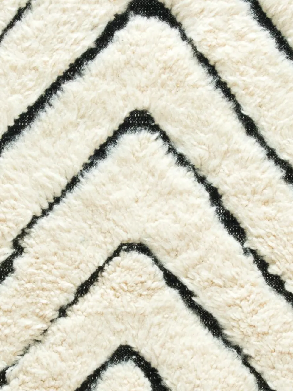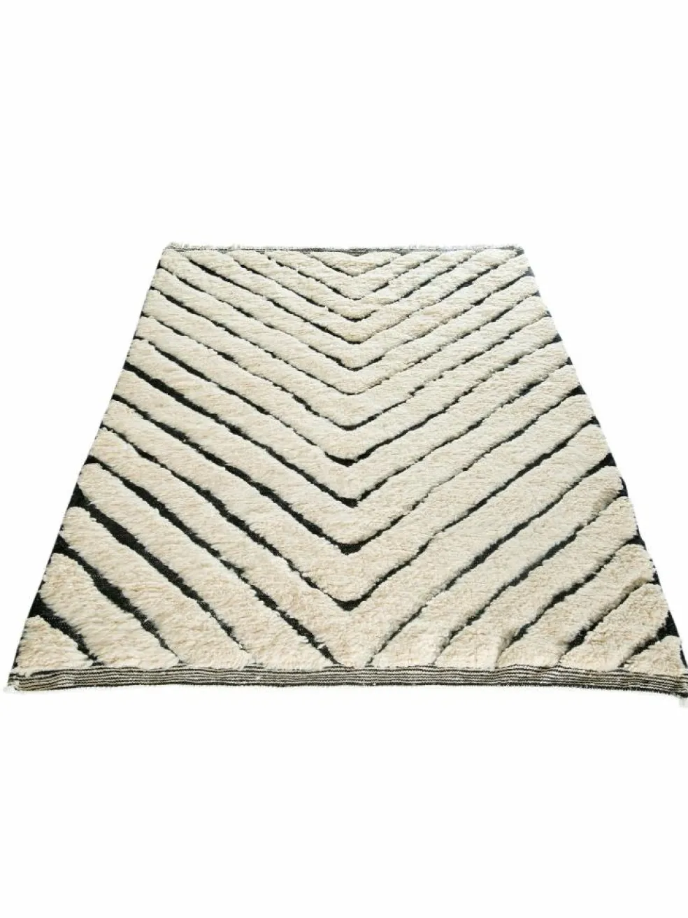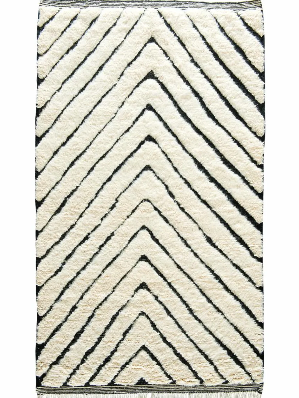 . Die Teppiche sind fast immer weißgrundig und zeichnen sich durch schwarze Zickzack-, Gitter- oder Rauten-Muster sowie einem wohnlich-zotteligen Flor aus. Kaum eine andere Teppichprovenienz passt mit ihren ursprünglichen nomadischen Designs besser in einen minimalistischen Wohnstil. Wie viele andere Nomadenteppiche auch, wurden dieBeni Ourain