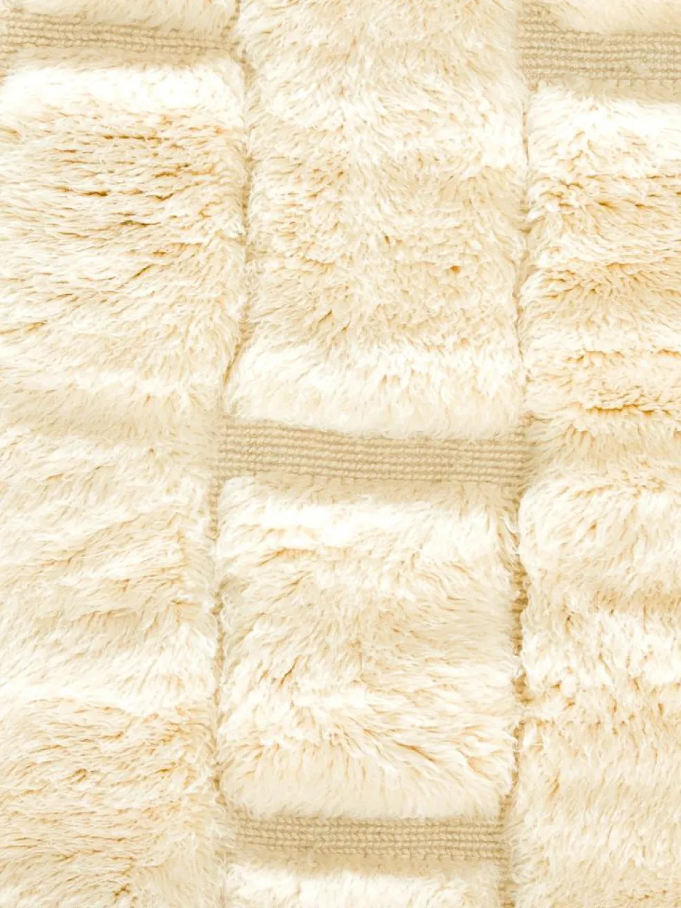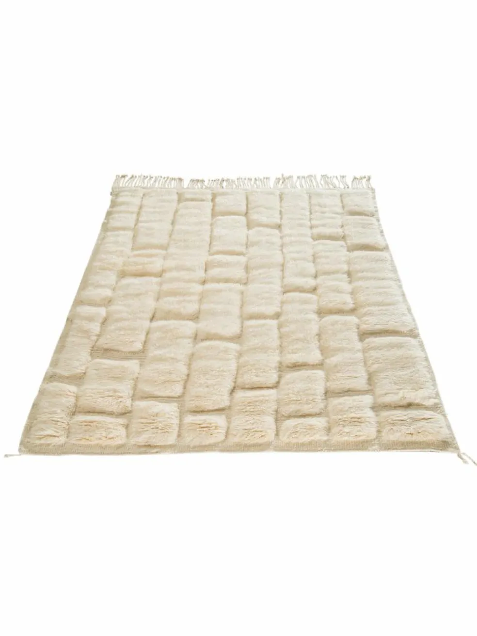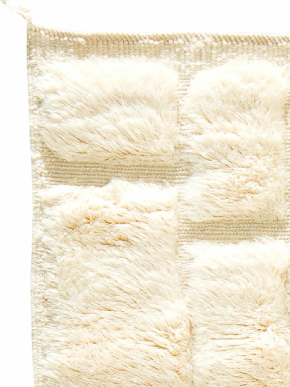 . Die Teppiche sind fast immer weißgrundig und zeichnen sich durch schwarze Zickzack-, Gitter- oder Rauten-Muster sowie einem wohnlich-zotteligen Flor aus. Kaum eine andere Teppichprovenienz passt mit ihren ursprünglichen nomadischen Designs besser in einen minimalistischen Wohnstil. Wie viele andere Nomadenteppiche auch, wurden dieBeni Ourain