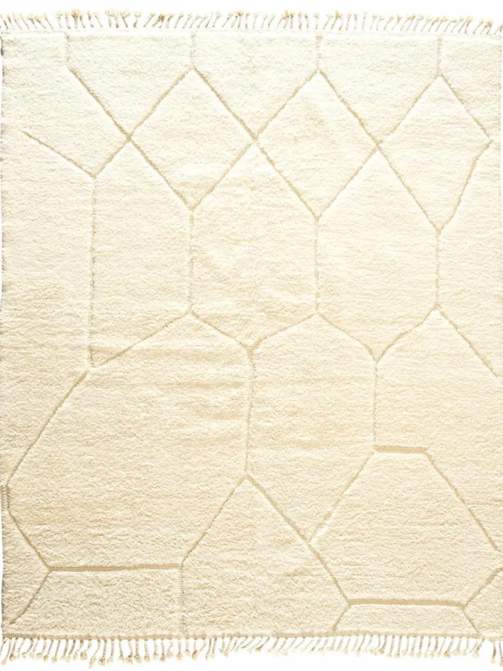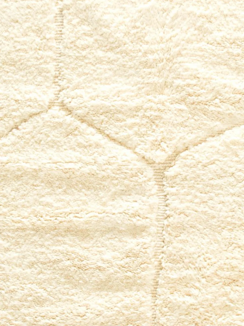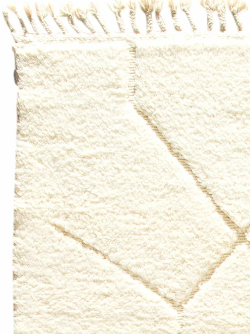 . Die Teppiche sind fast immer weißgrundig und zeichnen sich durch schwarze Zickzack-, Gitter- oder Rauten-Muster sowie einem wohnlich-zotteligen Flor aus. Kaum eine andere Teppichprovenienz passt mit ihren ursprünglichen nomadischen Designs besser in einen minimalistischen Wohnstil. Wie viele andere Nomadenteppiche auch, wurden dieBeni Ourain