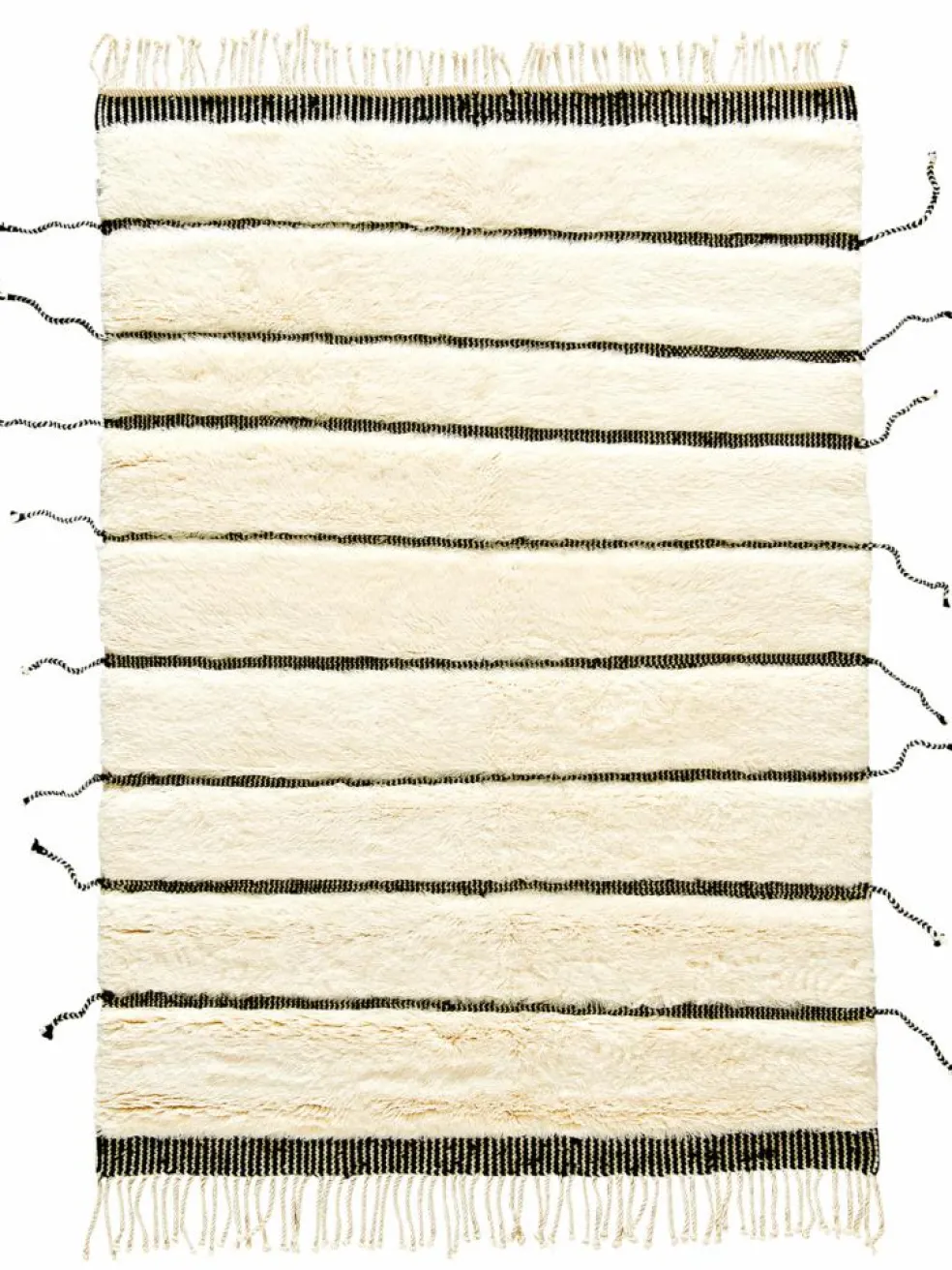 . Die Teppiche sind fast immer weißgrundig und zeichnen sich durch schwarze Zickzack-, Gitter- oder Rauten-Muster sowie einem wohnlich-zotteligen Flor aus. Kaum eine andere Teppichprovenienz passt mit ihren ursprünglichen nomadischen Designs besser in einen minimalistischen Wohnstil. Wie viele andere Nomadenteppiche auch, wurden dieBeni Ourain