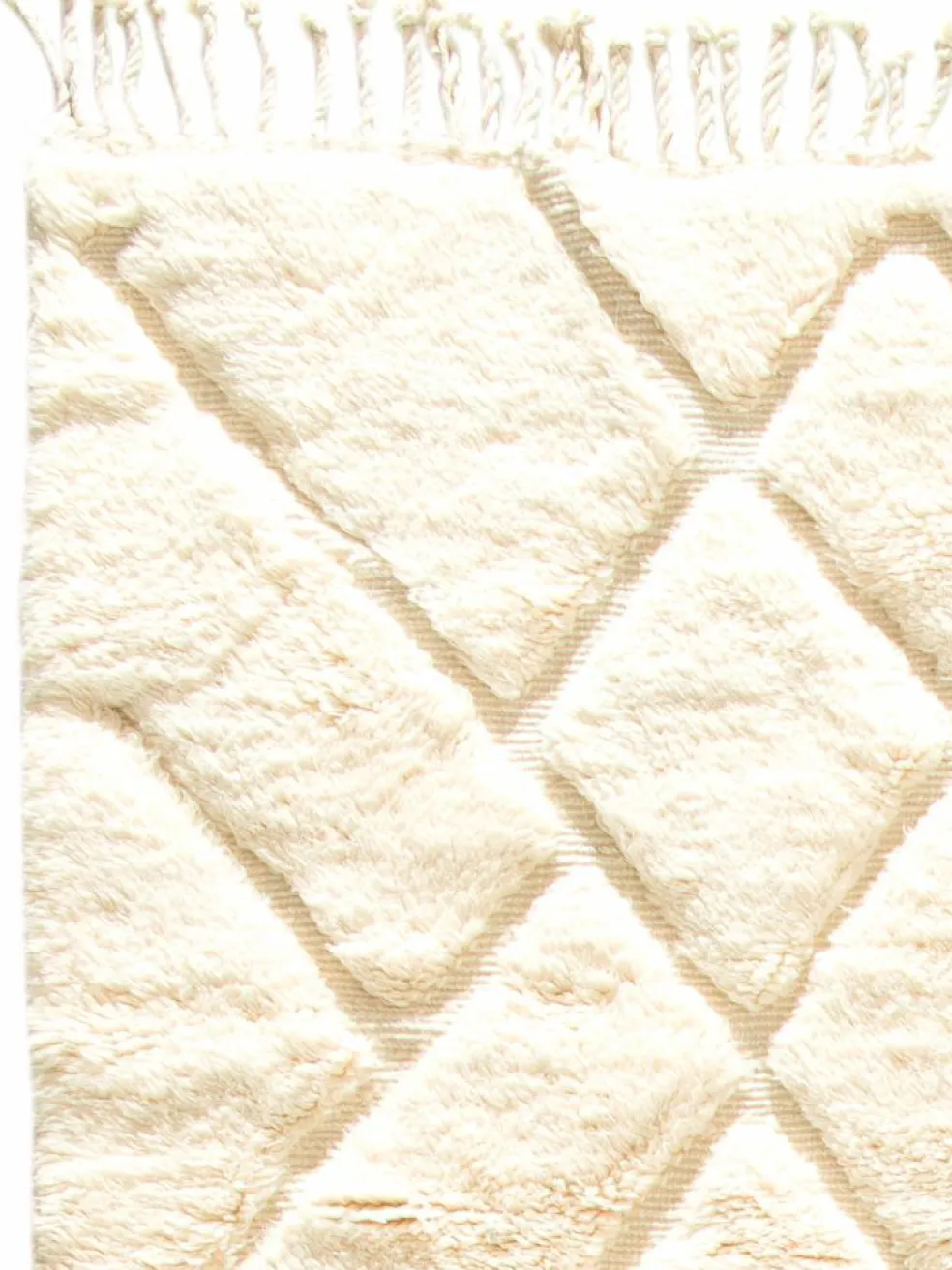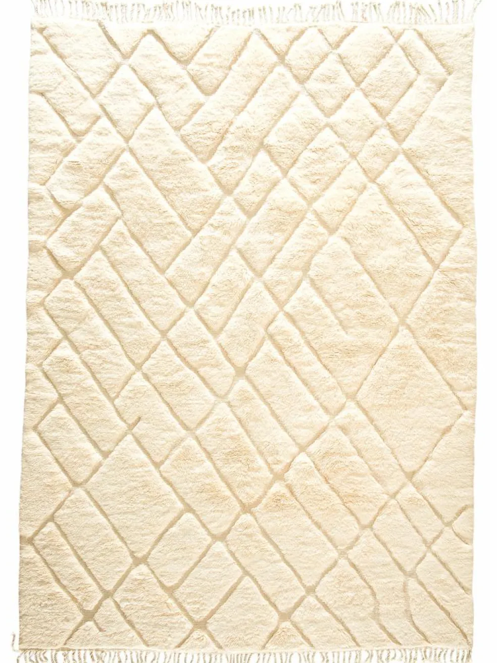 . Die Teppiche sind fast immer weißgrundig und zeichnen sich durch schwarze Zickzack-, Gitter- oder Rauten-Muster sowie einem wohnlich-zotteligen Flor aus. Kaum eine andere Teppichprovenienz passt mit ihren ursprünglichen nomadischen Designs besser in einen minimalistischen Wohnstil. Wie viele andere Nomadenteppiche auch, wurden dieBeni Ourain