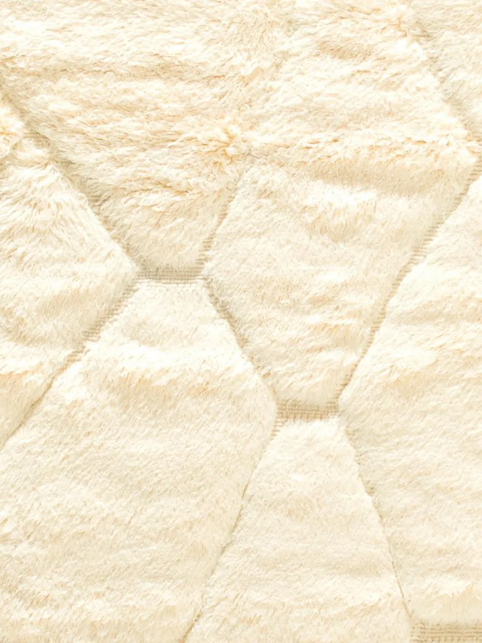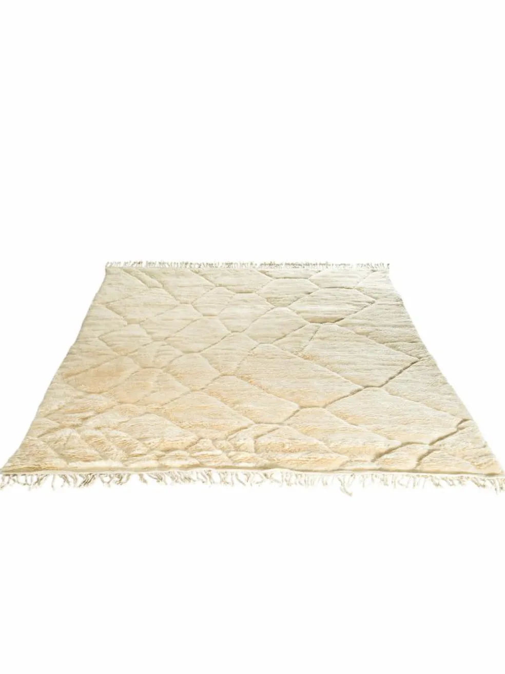 . Die Teppiche sind fast immer weißgrundig und zeichnen sich durch schwarze Zickzack-, Gitter- oder Rauten-Muster sowie einem wohnlich-zotteligen Flor aus. Kaum eine andere Teppichprovenienz passt mit ihren ursprünglichen nomadischen Designs besser in einen minimalistischen Wohnstil. Wie viele andere Nomadenteppiche auch, wurden dieBeni Ourain