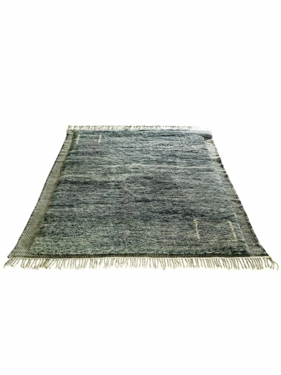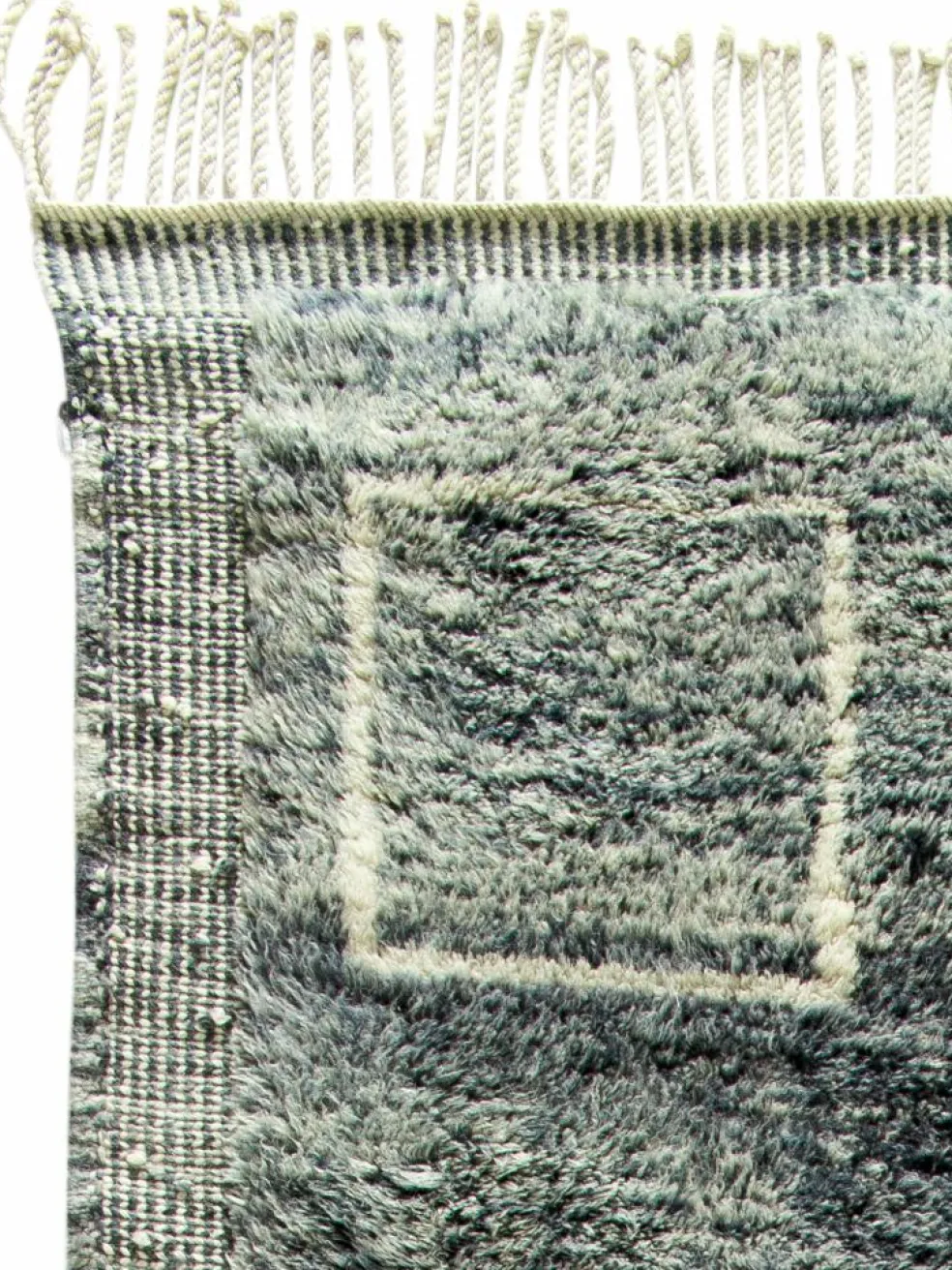 . Die Teppiche sind fast immer weißgrundig und zeichnen sich durch schwarze Zickzack-, Gitter- oder Rauten-Muster sowie einem wohnlich-zotteligen Flor aus. Kaum eine andere Teppichprovenienz passt mit ihren ursprünglichen nomadischen Designs besser in einen minimalistischen Wohnstil. Wie viele andere Nomadenteppiche auch, wurden dieBeni Ourain