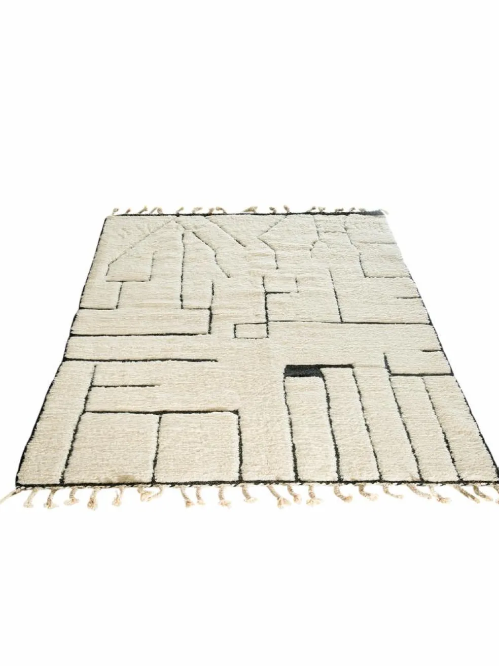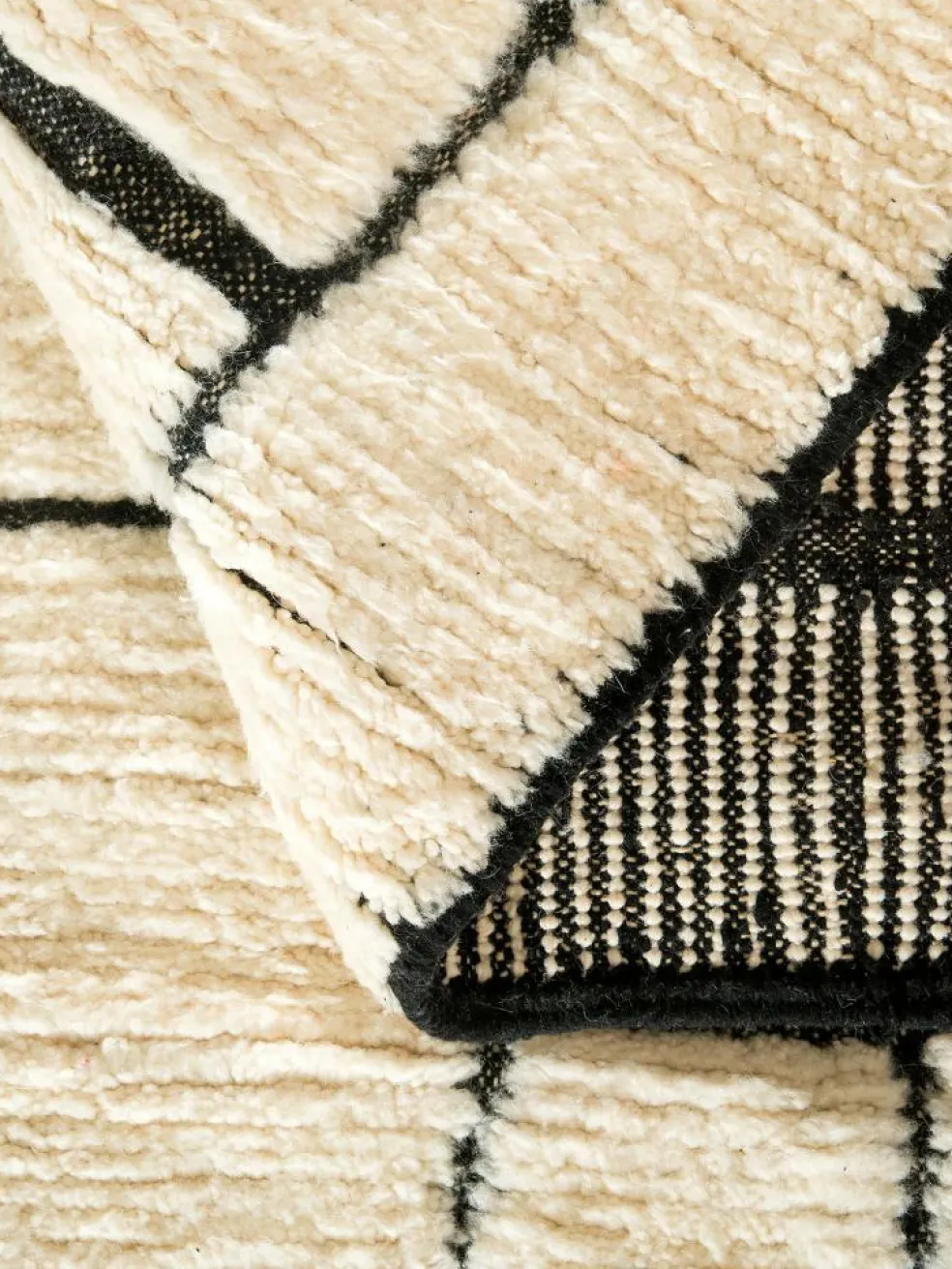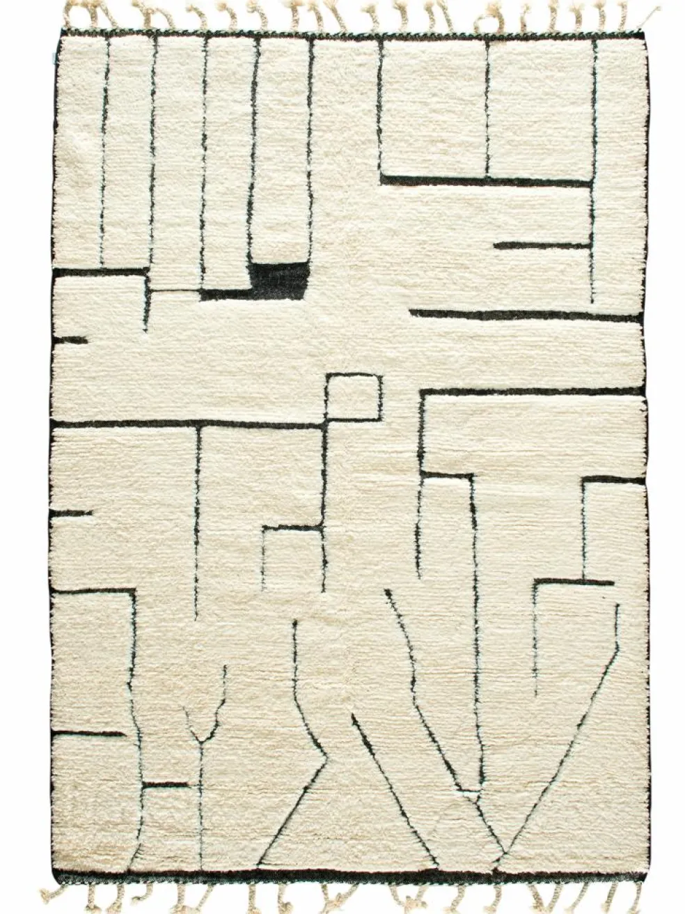 . Die Teppiche sind fast immer weißgrundig und zeichnen sich durch schwarze Zickzack-, Gitter- oder Rauten-Muster sowie einem wohnlich-zotteligen Flor aus. Kaum eine andere Teppichprovenienz passt mit ihren ursprünglichen nomadischen Designs besser in einen minimalistischen Wohnstil. Wie viele andere Nomadenteppiche auch, wurden dieBeni Ourain