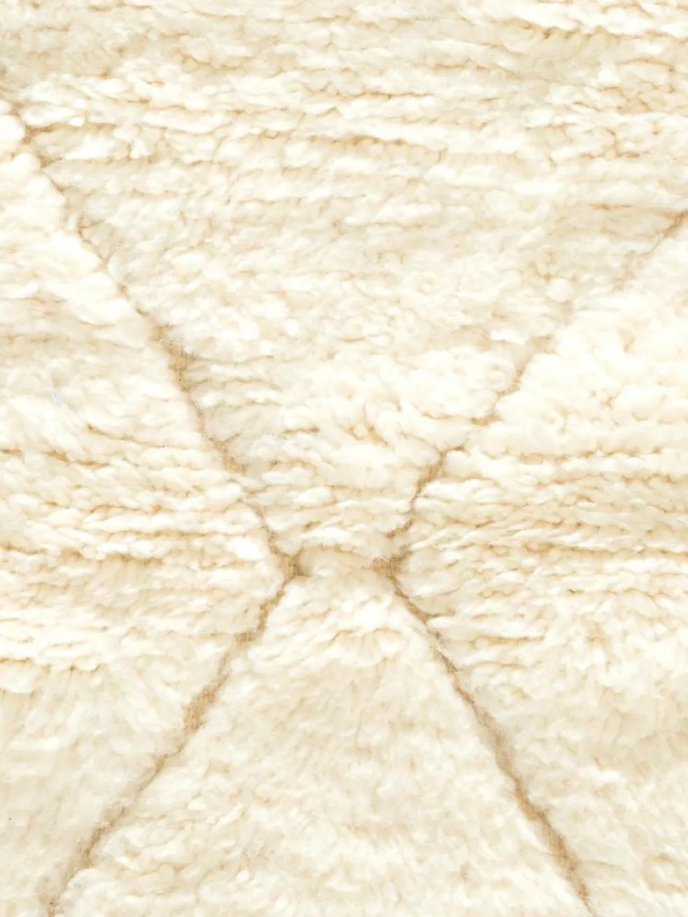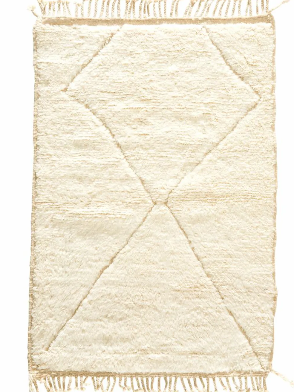 . Die Teppiche sind fast immer weißgrundig und zeichnen sich durch schwarze Zickzack-, Gitter- oder Rauten-Muster sowie einem wohnlich-zotteligen Flor aus. Kaum eine andere Teppichprovenienz passt mit ihren ursprünglichen nomadischen Designs besser in einen minimalistischen Wohnstil. Wie viele andere Nomadenteppiche auch, wurden dieBeni Ourain