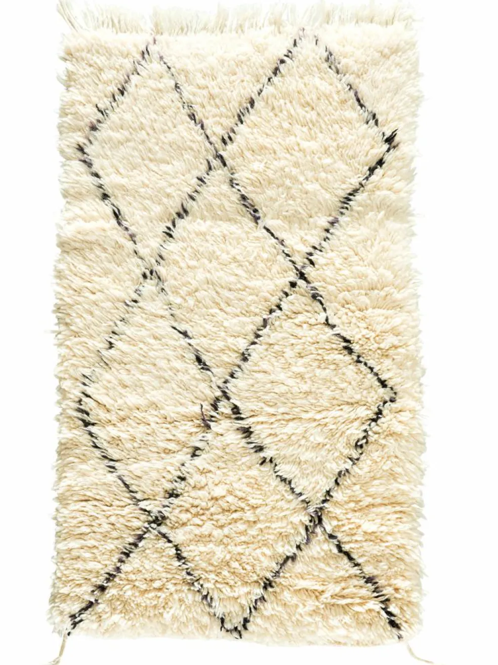 . Die Teppiche sind fast immer weißgrundig und zeichnen sich durch schwarze Zickzack-, Gitter- oder Rauten-Muster sowie einem wohnlich-zotteligen Flor aus. Kaum eine andere Teppichprovenienz passt mit ihren ursprünglichen nomadischen Designs besser in einen minimalistischen Wohnstil. Wie viele andere Nomadenteppiche auch, wurden dieBeni Ourain