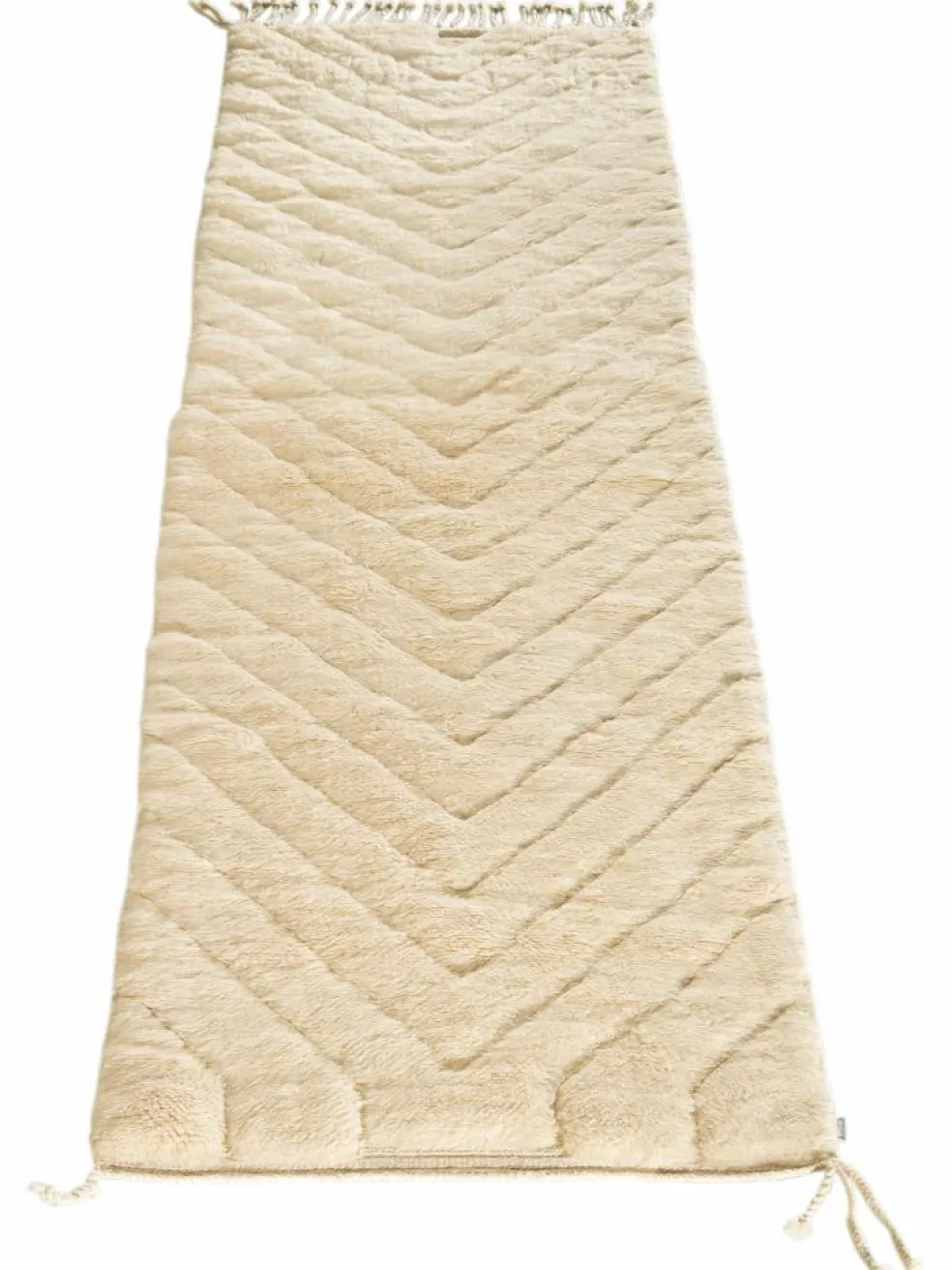 . Die Teppiche sind fast immer weißgrundig und zeichnen sich durch schwarze Zickzack-, Gitter- oder Rauten-Muster sowie einem wohnlich-zotteligen Flor aus. Kaum eine andere Teppichprovenienz passt mit ihren ursprünglichen nomadischen Designs besser in einen minimalistischen Wohnstil. Wie viele andere Nomadenteppiche auch, wurden dieBeni Ourain