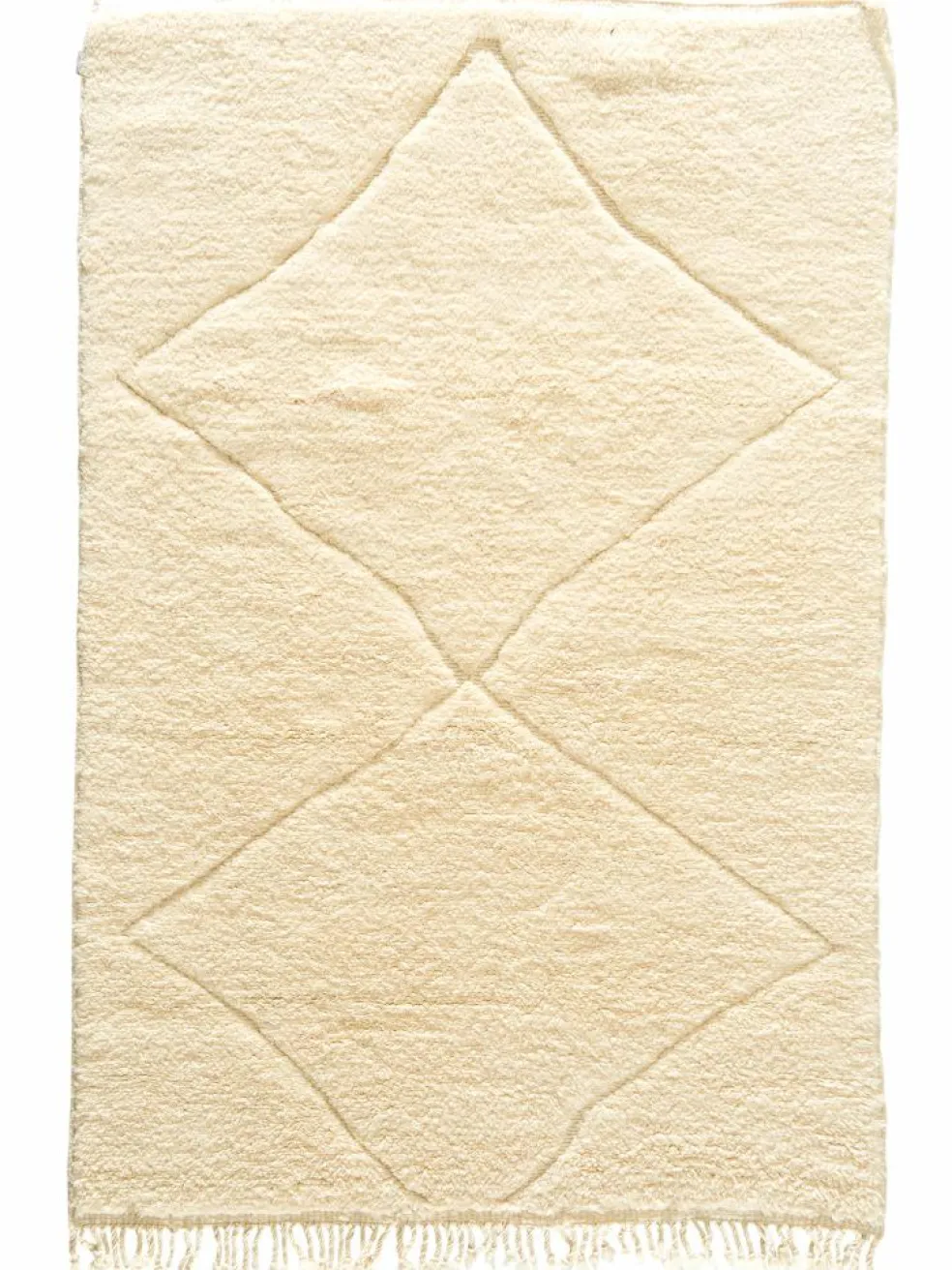 . Die Teppiche sind fast immer weißgrundig und zeichnen sich durch schwarze Zickzack-, Gitter- oder Rauten-Muster sowie einem wohnlich-zotteligen Flor aus. Kaum eine andere Teppichprovenienz passt mit ihren ursprünglichen nomadischen Designs besser in einen minimalistischen Wohnstil. Wie viele andere Nomadenteppiche auch, wurden dieBeni Ourain