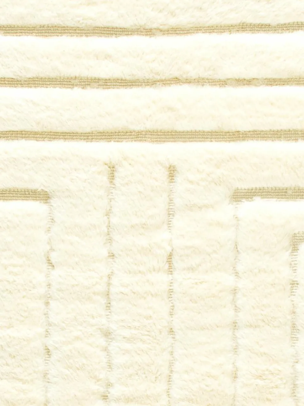 . Die Teppiche sind fast immer weißgrundig und zeichnen sich durch schwarze Zickzack-, Gitter- oder Rauten-Muster sowie einem wohnlich-zotteligen Flor aus. Kaum eine andere Teppichprovenienz passt mit ihren ursprünglichen nomadischen Designs besser in einen minimalistischen Wohnstil. Wie viele andere Nomadenteppiche auch, wurden dieBeni Ourain