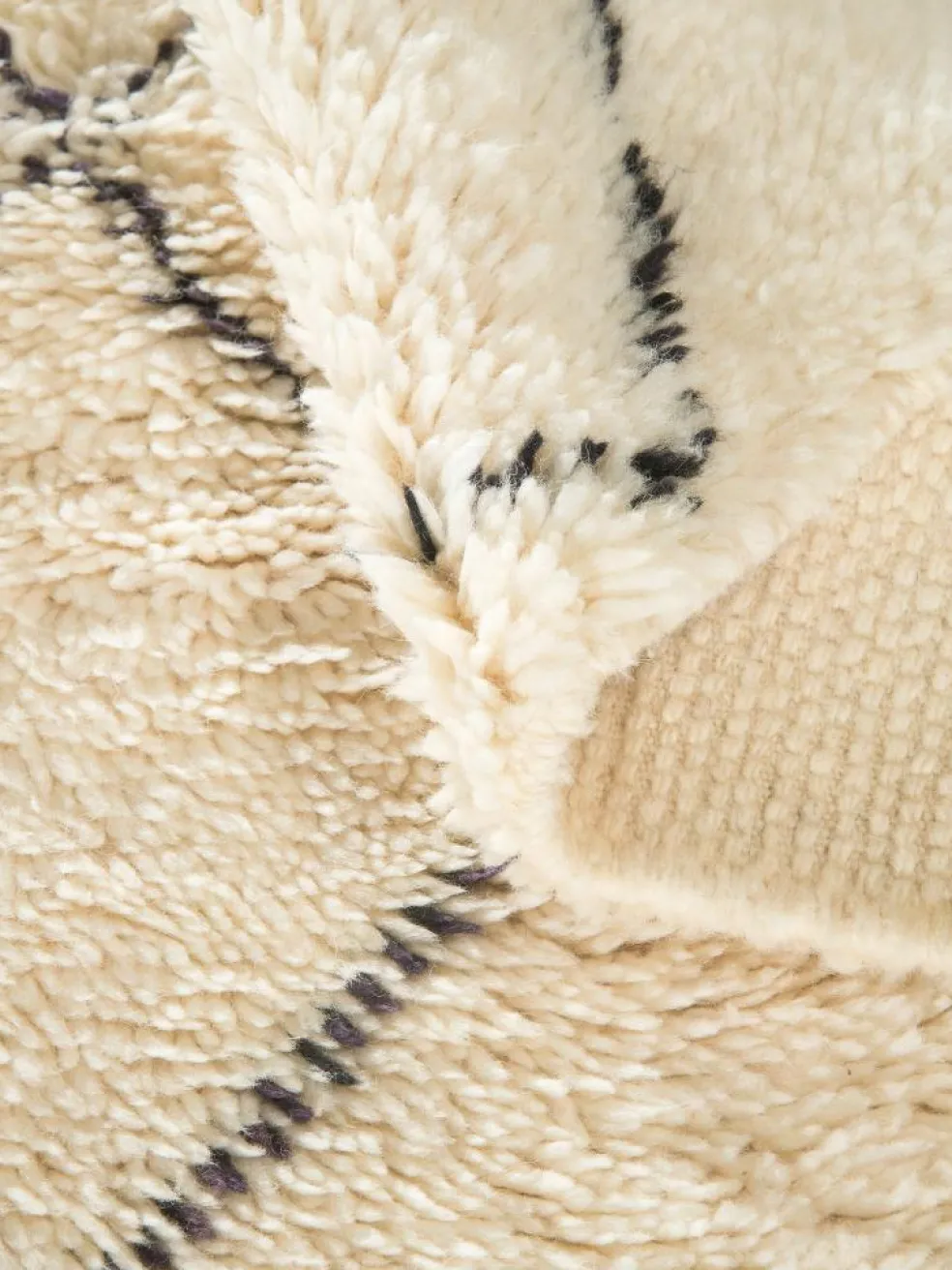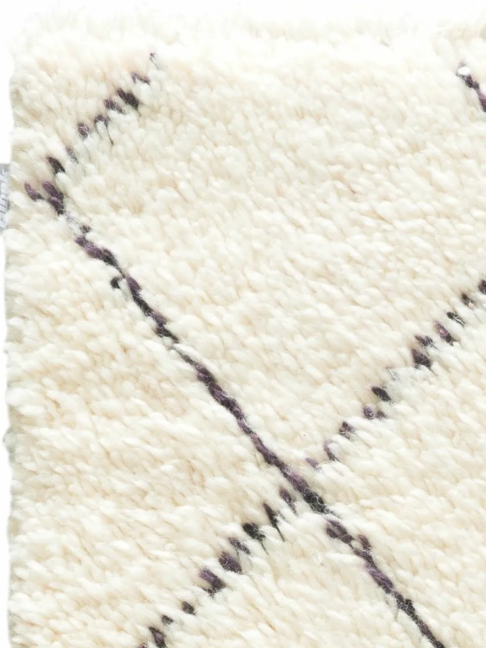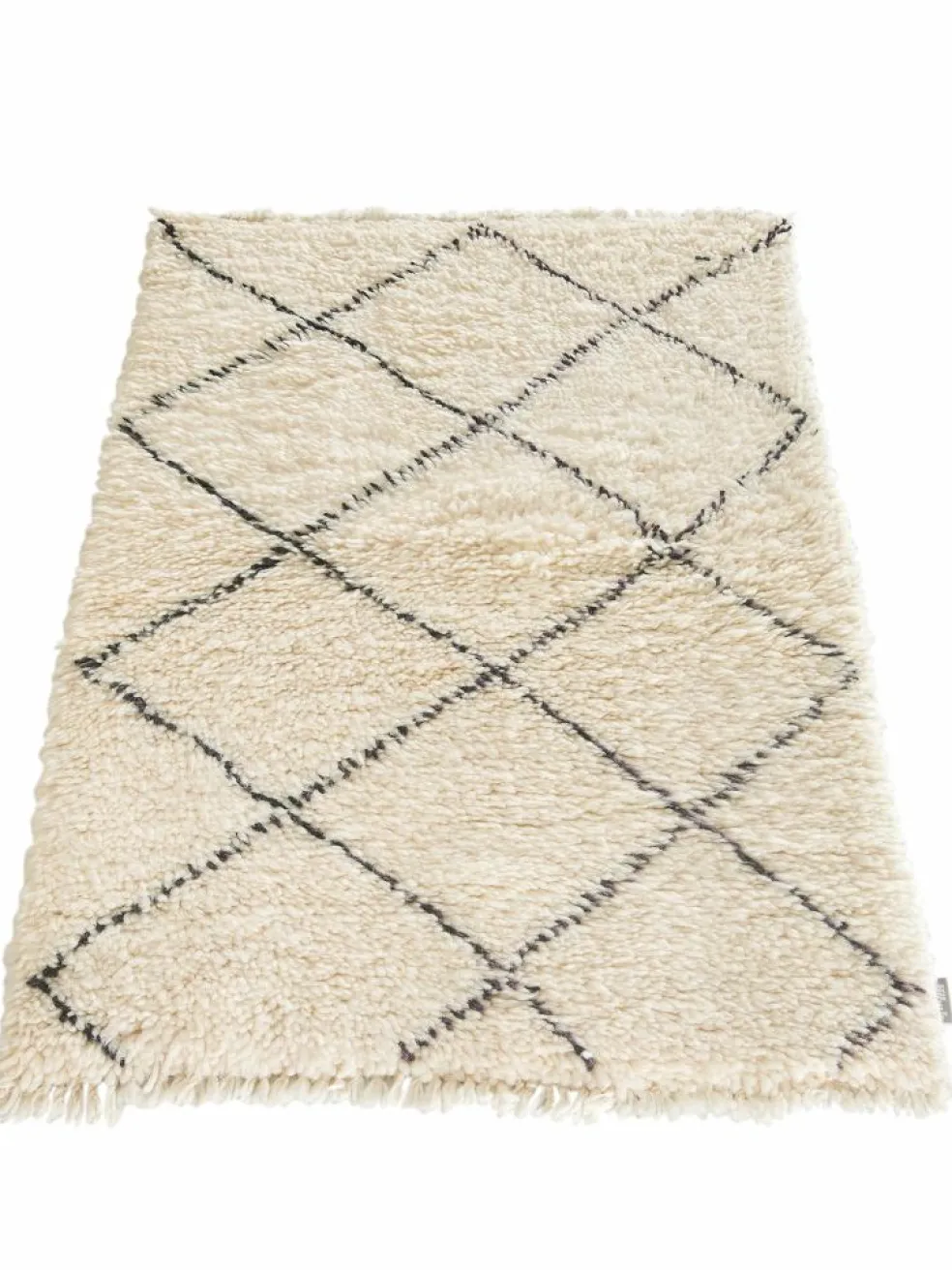 . Die Teppiche sind fast immer weißgrundig und zeichnen sich durch schwarze Zickzack-, Gitter- oder Rauten-Muster sowie einem wohnlich-zotteligen Flor aus. Kaum eine andere Teppichprovenienz passt mit ihren ursprünglichen nomadischen Designs besser in einen minimalistischen Wohnstil. Wie viele andere Nomadenteppiche auch, wurden dieBeni Ourain