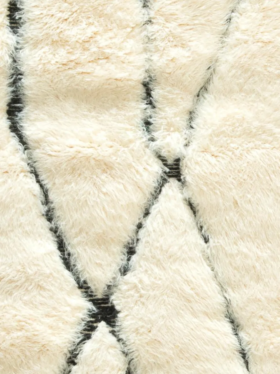 . Die Teppiche sind fast immer weißgrundig und zeichnen sich durch schwarze Zickzack-, Gitter- oder Rauten-Muster sowie einem wohnlich-zotteligen Flor aus. Kaum eine andere Teppichprovenienz passt mit ihren ursprünglichen nomadischen Designs besser in einen minimalistischen Wohnstil. Wie viele andere Nomadenteppiche auch, wurden dieBeni Ourain