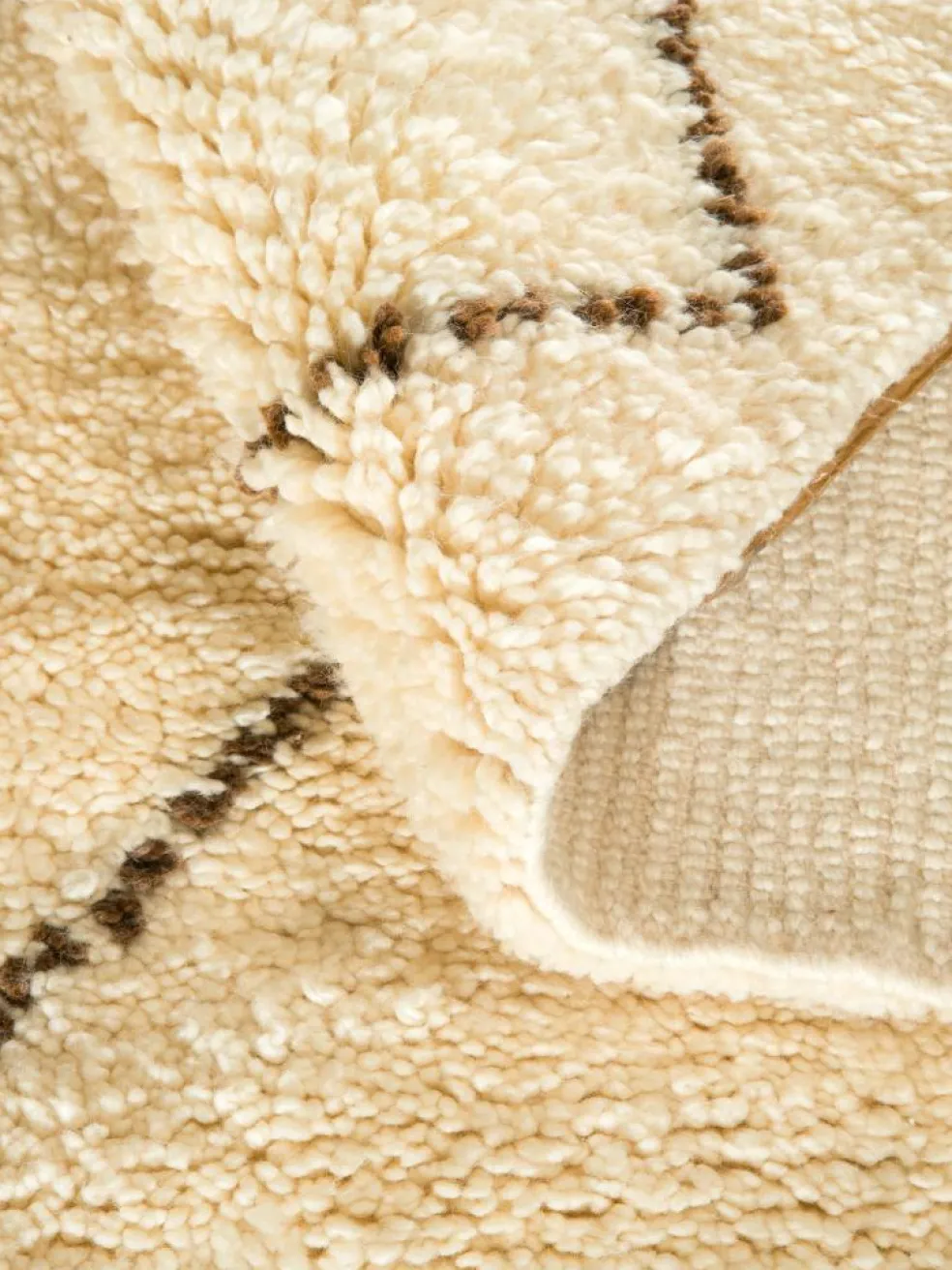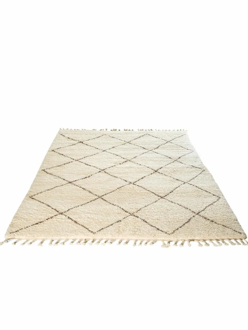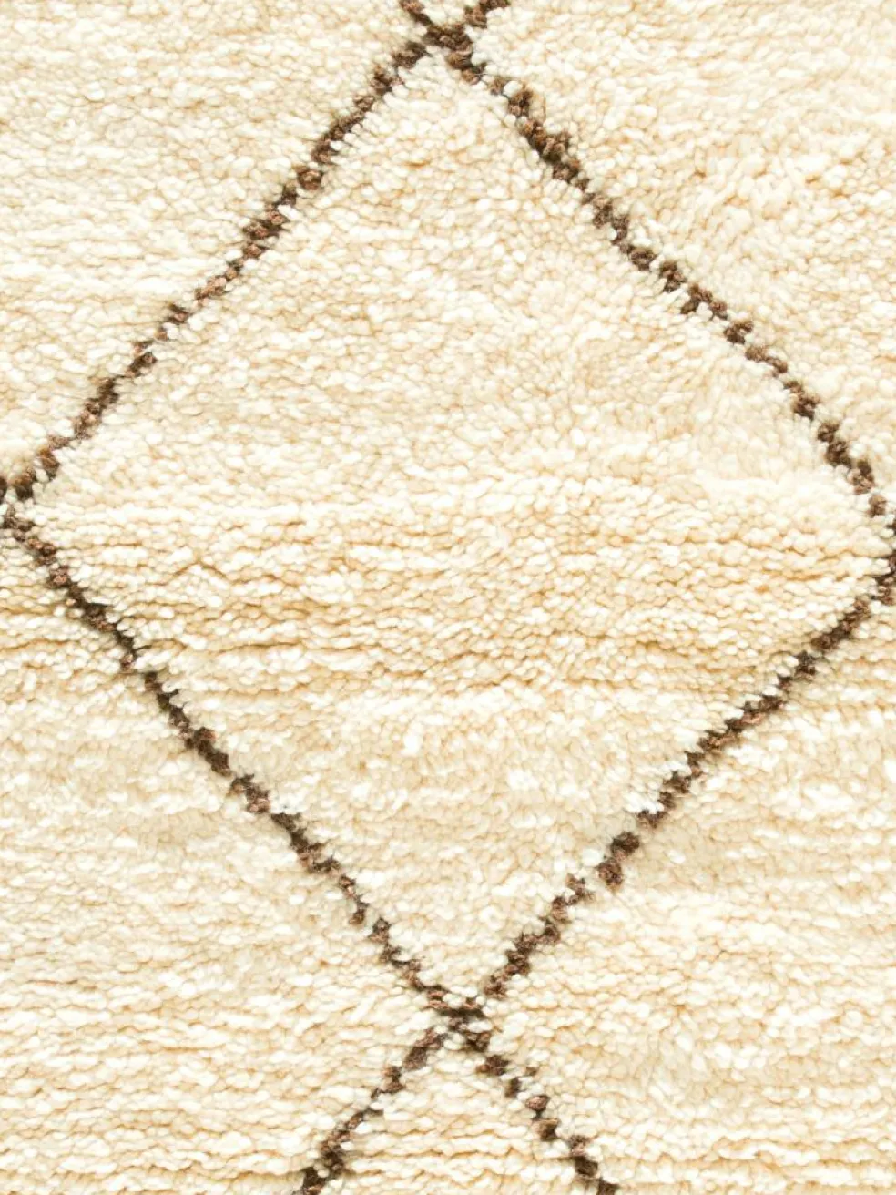 . Die Teppiche sind fast immer weißgrundig und zeichnen sich durch schwarze Zickzack-, Gitter- oder Rauten-Muster sowie einem wohnlich-zotteligen Flor aus. Kaum eine andere Teppichprovenienz passt mit ihren ursprünglichen nomadischen Designs besser in einen minimalistischen Wohnstil. Wie viele andere Nomadenteppiche auch, wurden dieBeni Ourain