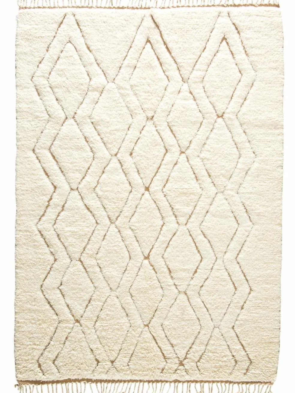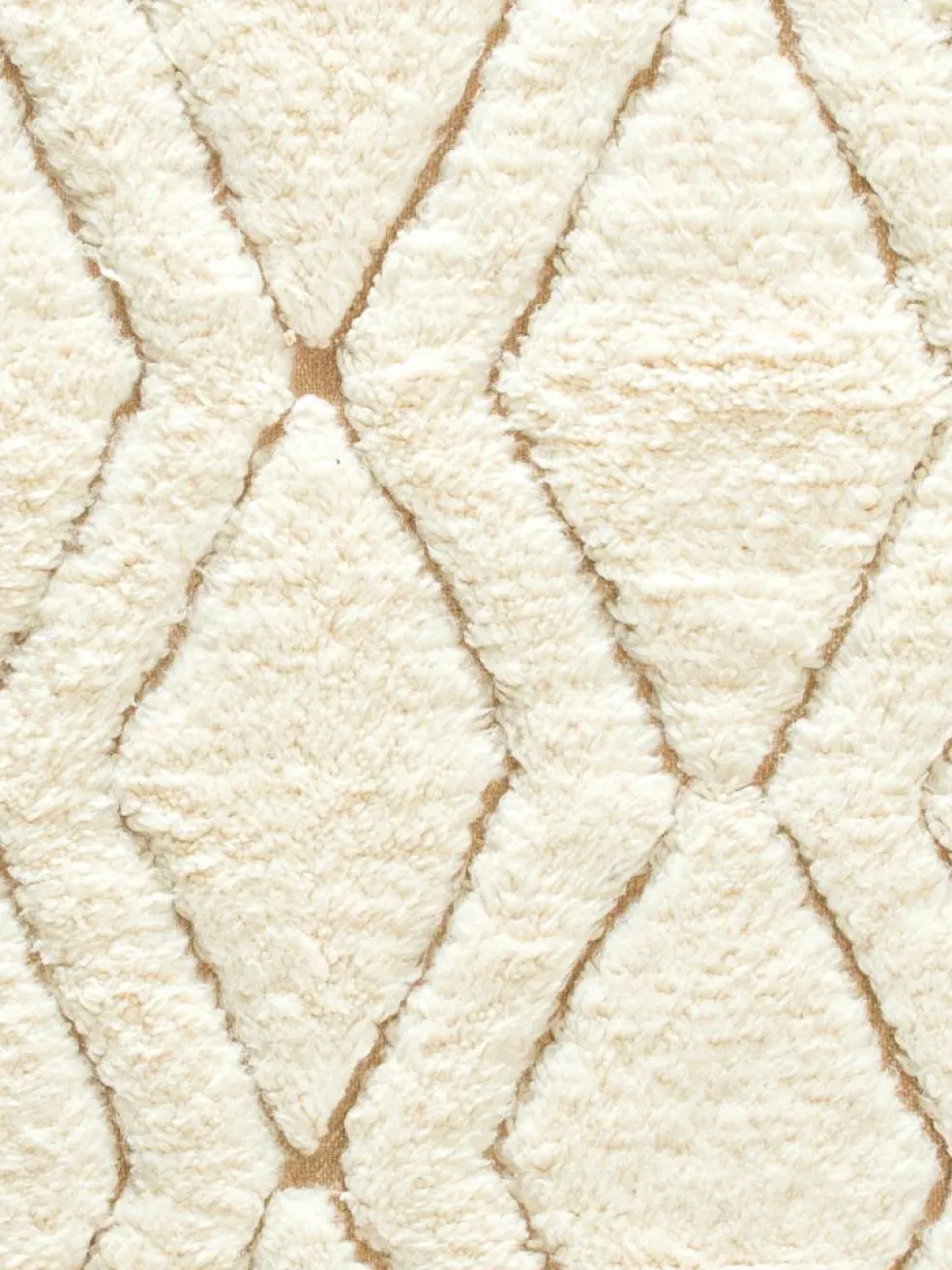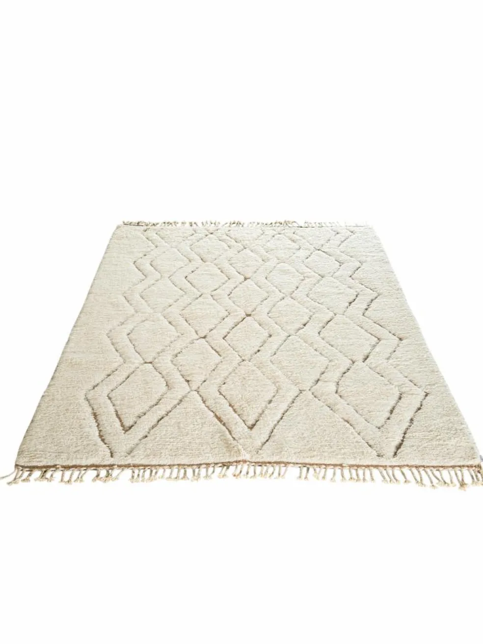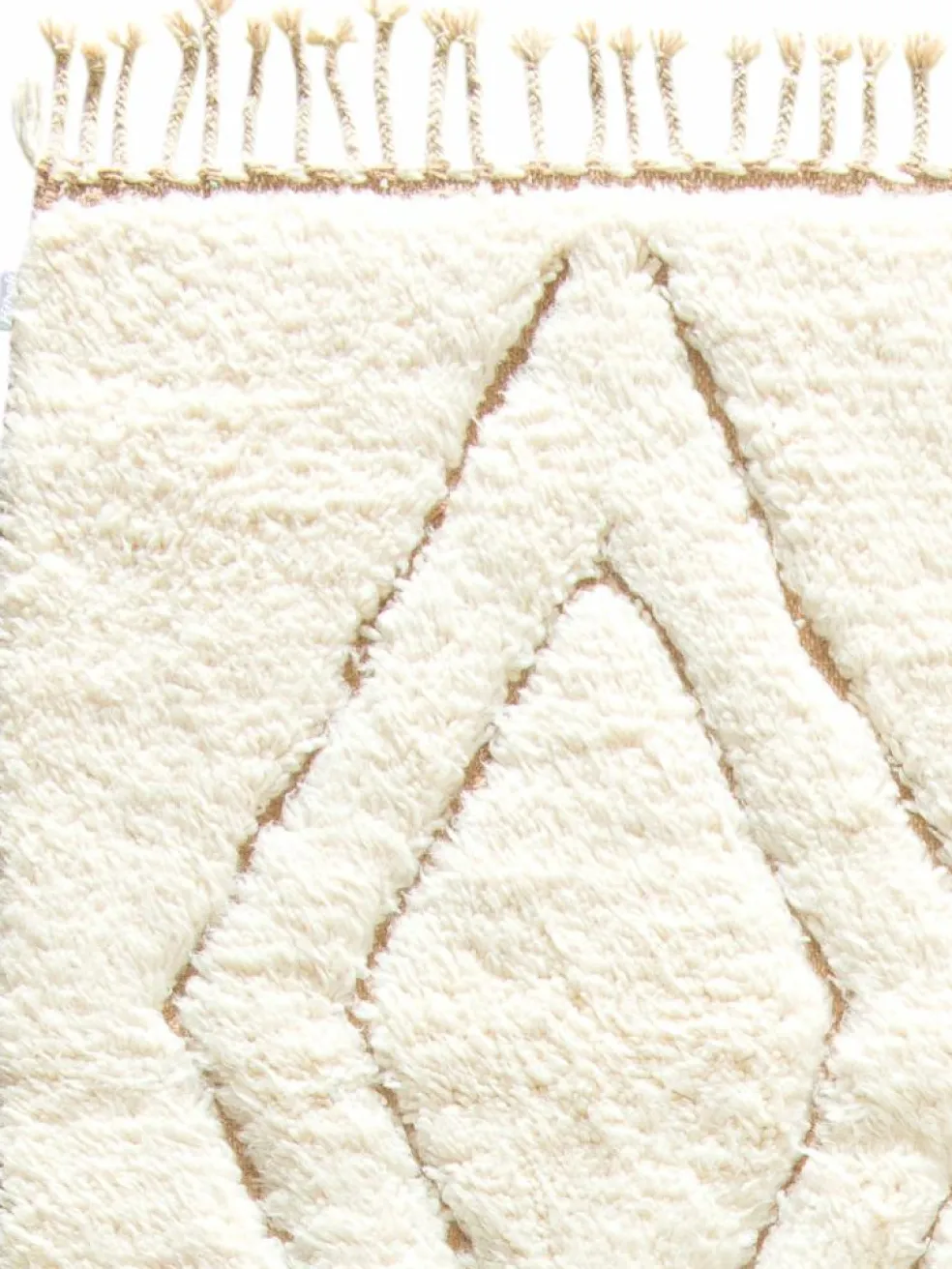 . Die Teppiche sind fast immer weißgrundig und zeichnen sich durch schwarze Zickzack-, Gitter- oder Rauten-Muster sowie einem wohnlich-zotteligen Flor aus. Kaum eine andere Teppichprovenienz passt mit ihren ursprünglichen nomadischen Designs besser in einen minimalistischen Wohnstil. Wie viele andere Nomadenteppiche auch, wurden dieBeni Ourain