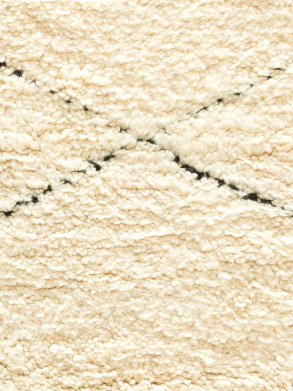 . Die Teppiche sind fast immer weißgrundig und zeichnen sich durch schwarze Zickzack-, Gitter- oder Rauten-Muster sowie einem wohnlich-zotteligen Flor aus. Kaum eine andere Teppichprovenienz passt mit ihren ursprünglichen nomadischen Designs besser in einen minimalistischen Wohnstil. Wie viele andere Nomadenteppiche auch, wurden dieBeni Ourain