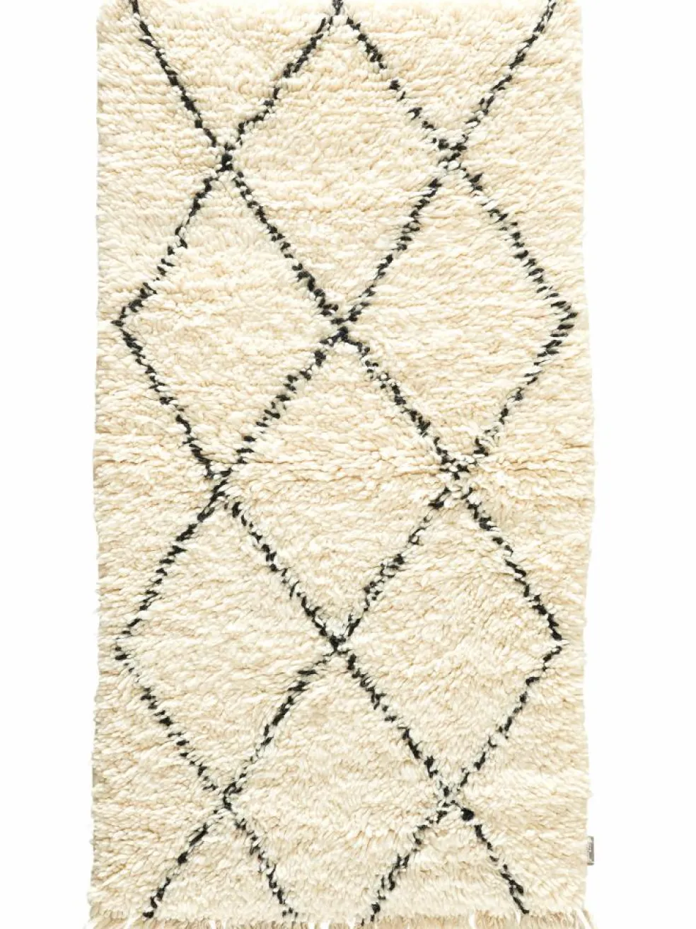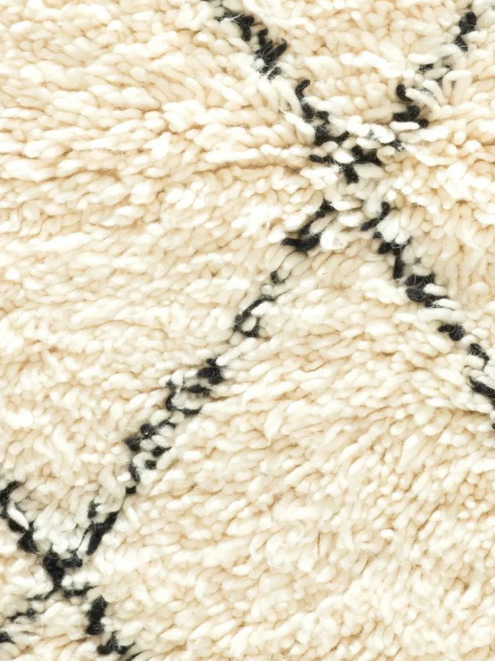 . Die Teppiche sind fast immer weißgrundig und zeichnen sich durch schwarze Zickzack-, Gitter- oder Rauten-Muster sowie einem wohnlich-zotteligen Flor aus. Kaum eine andere Teppichprovenienz passt mit ihren ursprünglichen nomadischen Designs besser in einen minimalistischen Wohnstil. Wie viele andere Nomadenteppiche auch, wurden dieBeni Ourain