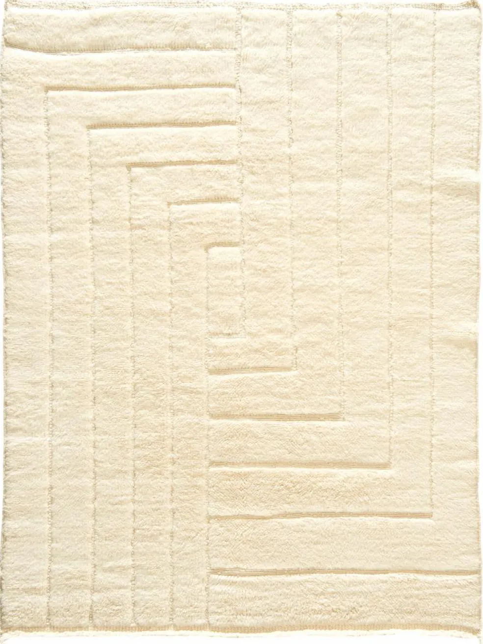 . Die Teppiche sind fast immer weißgrundig und zeichnen sich durch schwarze Zickzack-, Gitter- oder Rauten-Muster sowie einem wohnlich-zotteligen Flor aus. Kaum eine andere Teppichprovenienz passt mit ihren ursprünglichen nomadischen Designs besser in einen minimalistischen Wohnstil. Wie viele andere Nomadenteppiche auch, wurden dieBeni Ourain