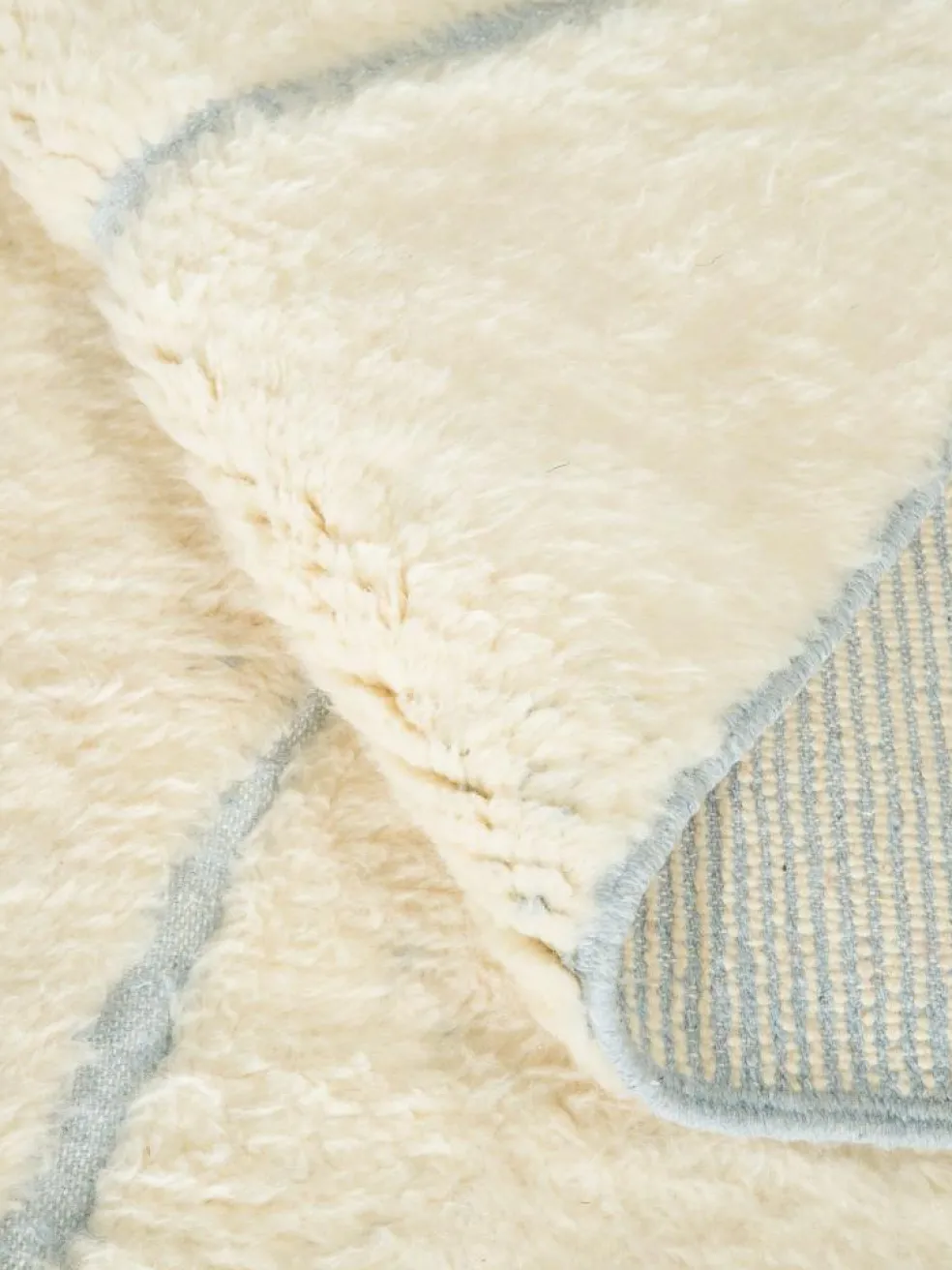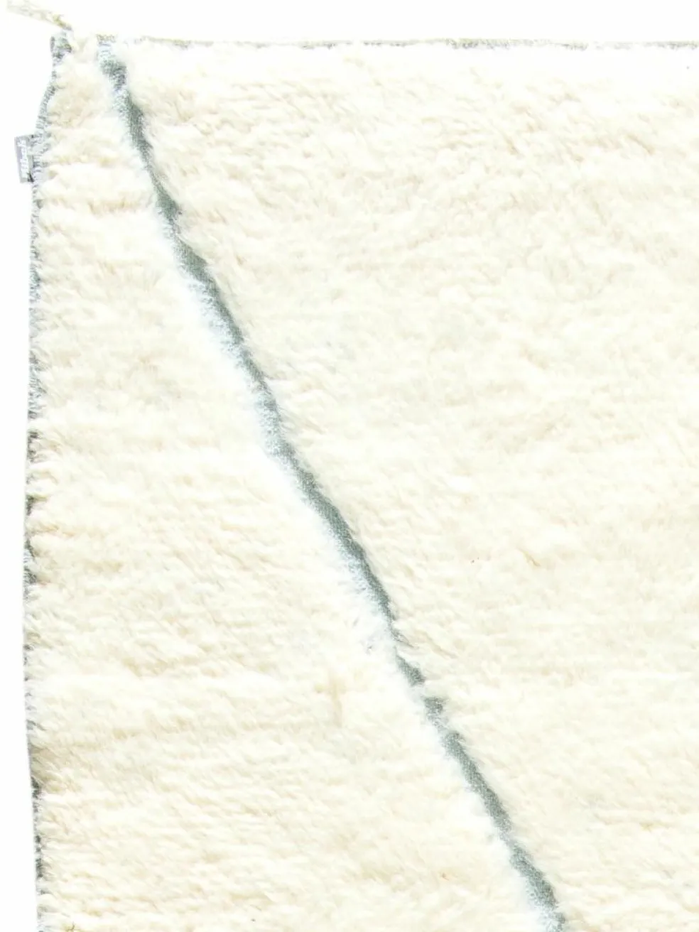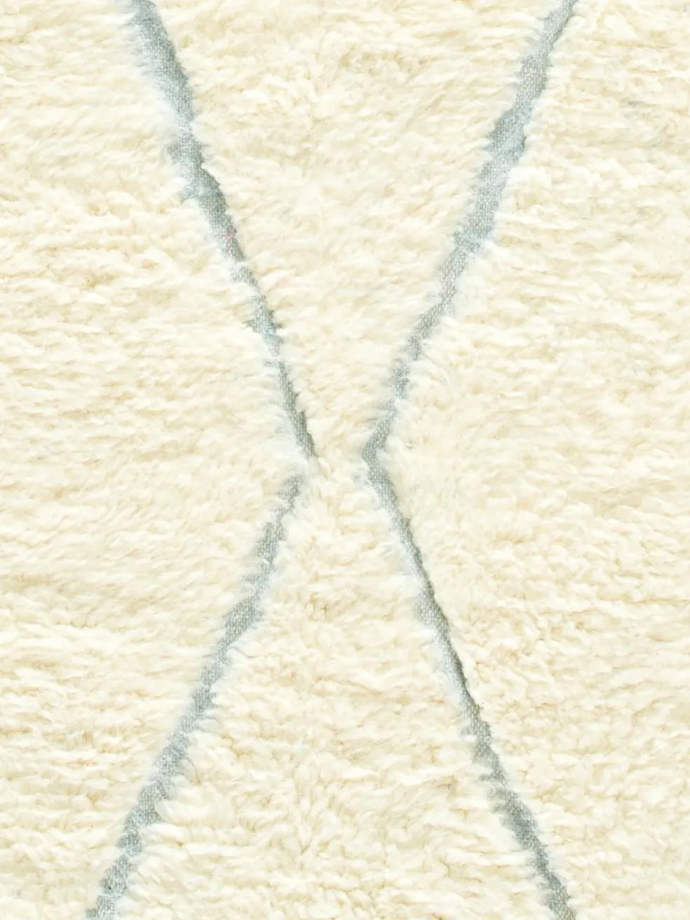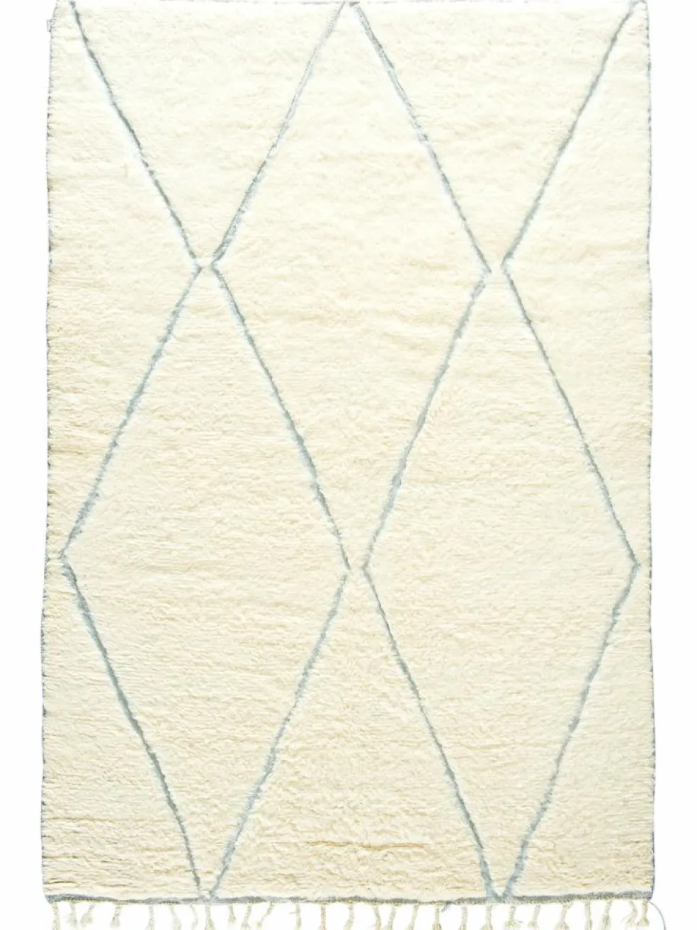 . Die Teppiche sind fast immer weißgrundig und zeichnen sich durch schwarze Zickzack-, Gitter- oder Rauten-Muster sowie einem wohnlich-zotteligen Flor aus. Kaum eine andere Teppichprovenienz passt mit ihren ursprünglichen nomadischen Designs besser in einen minimalistischen Wohnstil. Wie viele andere Nomadenteppiche auch, wurden dieBeni Ourain