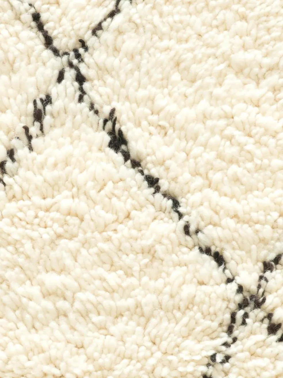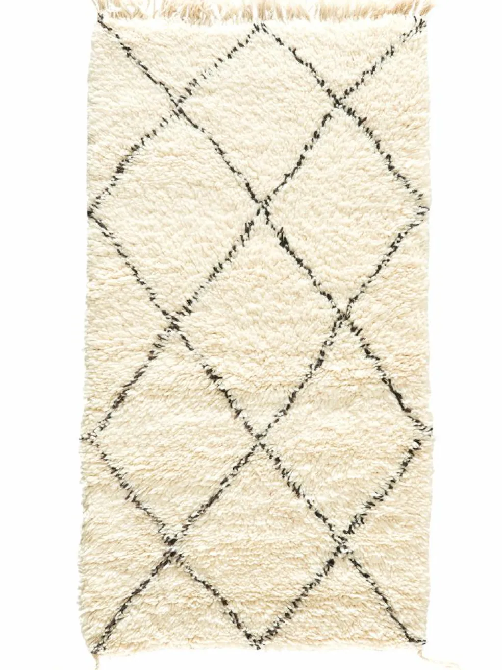 . Die Teppiche sind fast immer weißgrundig und zeichnen sich durch schwarze Zickzack-, Gitter- oder Rauten-Muster sowie einem wohnlich-zotteligen Flor aus. Kaum eine andere Teppichprovenienz passt mit ihren ursprünglichen nomadischen Designs besser in einen minimalistischen Wohnstil. Wie viele andere Nomadenteppiche auch, wurden dieBeni Ourain