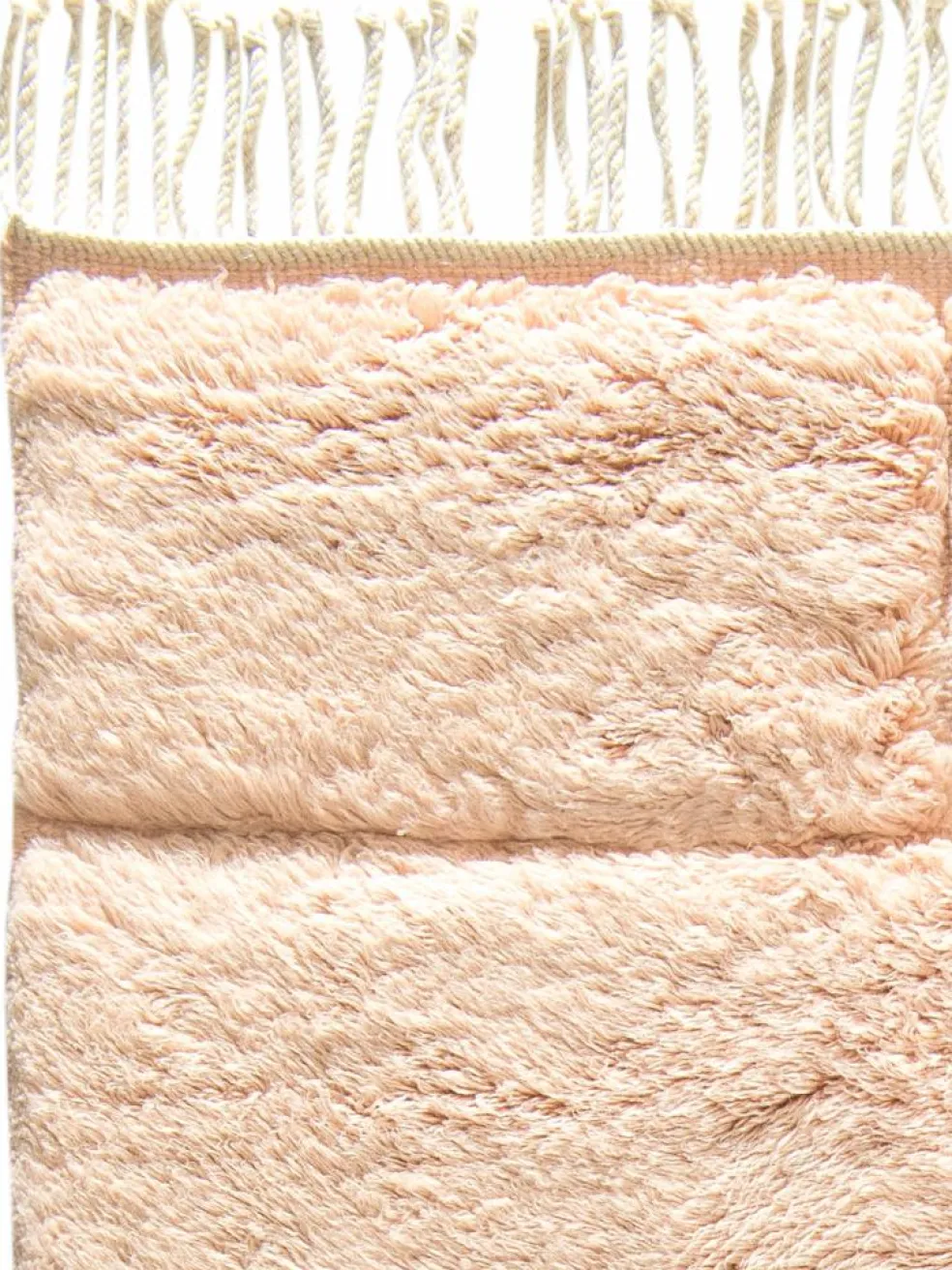. Die Teppiche sind fast immer weißgrundig und zeichnen sich durch schwarze Zickzack-, Gitter- oder Rauten-Muster sowie einem wohnlich-zotteligen Flor aus. Kaum eine andere Teppichprovenienz passt mit ihren ursprünglichen nomadischen Designs besser in einen minimalistischen Wohnstil. Wie viele andere Nomadenteppiche auch, wurden dieBeni Ourain