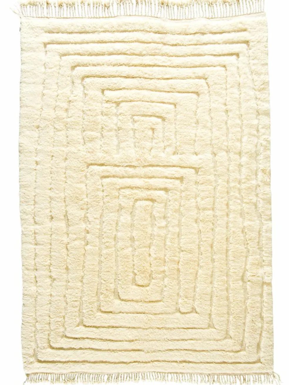 . Die Teppiche sind fast immer weißgrundig und zeichnen sich durch schwarze Zickzack-, Gitter- oder Rauten-Muster sowie einem wohnlich-zotteligen Flor aus. Kaum eine andere Teppichprovenienz passt mit ihren ursprünglichen nomadischen Designs besser in einen minimalistischen Wohnstil. Wie viele andere Nomadenteppiche auch, wurden dieBeni Ourain