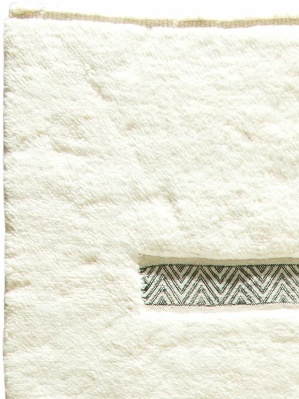. Die Teppiche sind fast immer weißgrundig und zeichnen sich durch schwarze Zickzack-, Gitter- oder Rauten-Muster sowie einem wohnlich-zotteligen Flor aus. Kaum eine andere Teppichprovenienz passt mit ihren ursprünglichen nomadischen Designs besser in einen minimalistischen Wohnstil. Wie viele andere Nomadenteppiche auch, wurden dieBeni Ourain