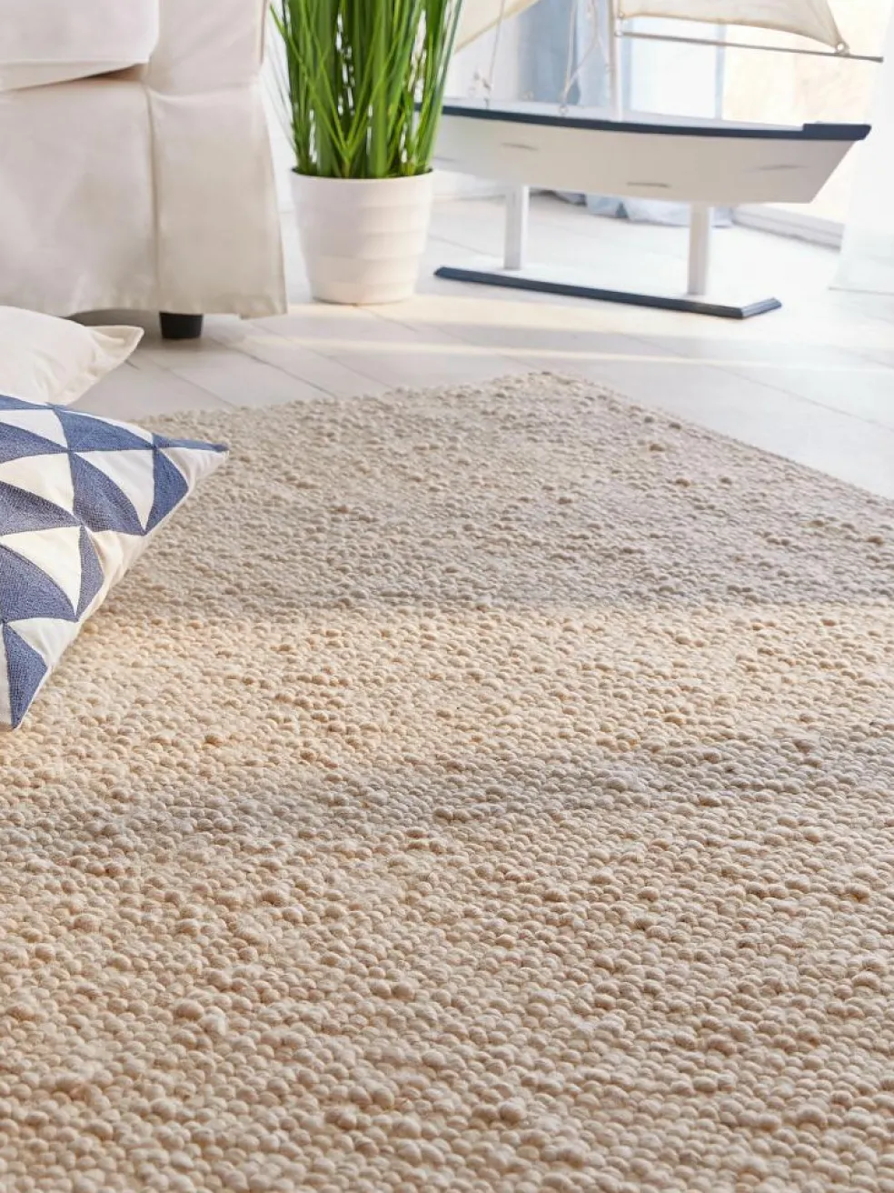 aus Neuseeland im Obergewebe und das stolze Gesamtgewicht von ca. 2.850 g pro m² überzeugen in puncto Belastbarkeit und langer Lebensdauer. Praktischer Weise ist dieser Naturfaser-Teppich beidseitig verwendbar. Zu diesem Handwebteppich empfehlen wir zur Sicherheit auf Schritt und Tritt die KIBEK ALLSTOP-SUPER Teppich-Spezialunterlage. Teppiche ausSchurwolle