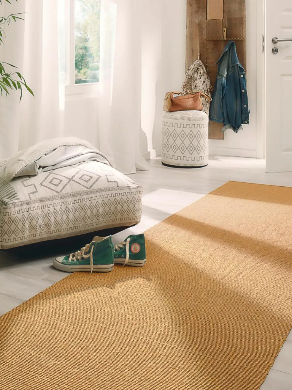 Mit Bouclé bezeichnet man Textilien, die über eine ripsartige Oberfläche verfügen. Unser BOUCLÉ-STRONG ist ein gewebter Läufer mit diesem beliebten Relief-Effekt. Als Material für das Obergewebe wurde eine reine Sisalfaser verwendet, die ausgesprochen zugfest ist, sich durch eine hohe Steifigkeit auszeichnet – und damit prädestiniert ist für die Verwendung für einen Läufer, der hohen Belastungen Stand halten muss. Der BOUCLÉ-STRONG ist langlebig und außerordentlich strapazierfähig. Er ist in angenehm natürlichen Farben und verschiedenen Breiten erhältlich. Rückseitig rutschhemmend ausgerüstet. Die Schnittkanten werden grundsätzlich mit farblich passendem Garn gekettelt. Zu diesem Teppich empfehlen wir zur Sicherheit auf Schritt und Tritt für Laminat und Parkett die KIBEK ALLSTOP-SUPER Teppich-Spezialunterlage. Durch Lagerung und Transport kann es beim ersten Legen des Teppichs zu Wellenbildung kommen. Sobald der Teppich belaufen wird, glättet sich die Oberfläche. Oberfläche aus 100% Sisal.