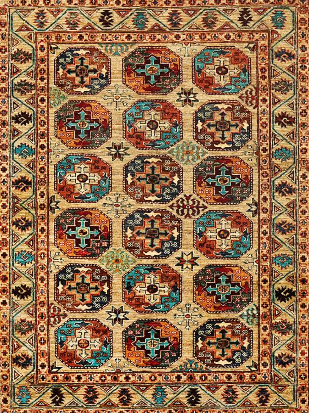 zeigt im Muster das klassische turkmenische Bucharadesign. Als Vorbild dienen dabei die jeweilige Stammeszeichen (Gül