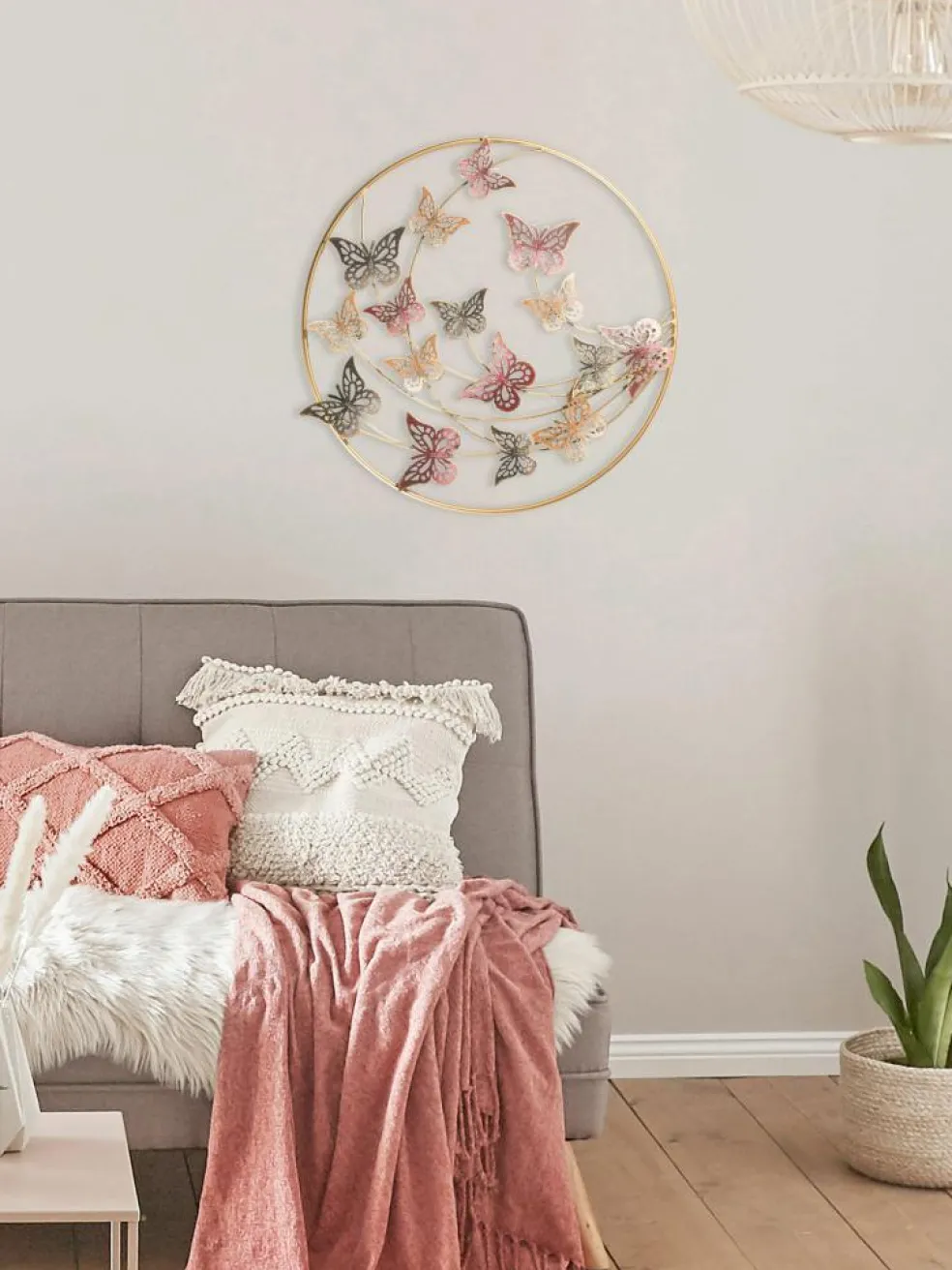 Ein bunter Schwarm Schmetterlinge! Aus Metall gefertigtes rundes Wandobjekt. Ca. 64,5 x 21,5 x 64,5 cm groß.