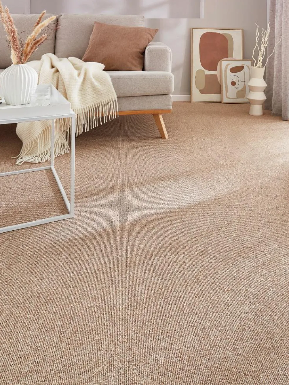Klassischer, naturfarbener schwerer Woll-Teppichboden mit dezenter Zeichnung. Gesamtgewicht ca. 1670 g pro m². Höhe ca. 7 mm. Flor 100 %