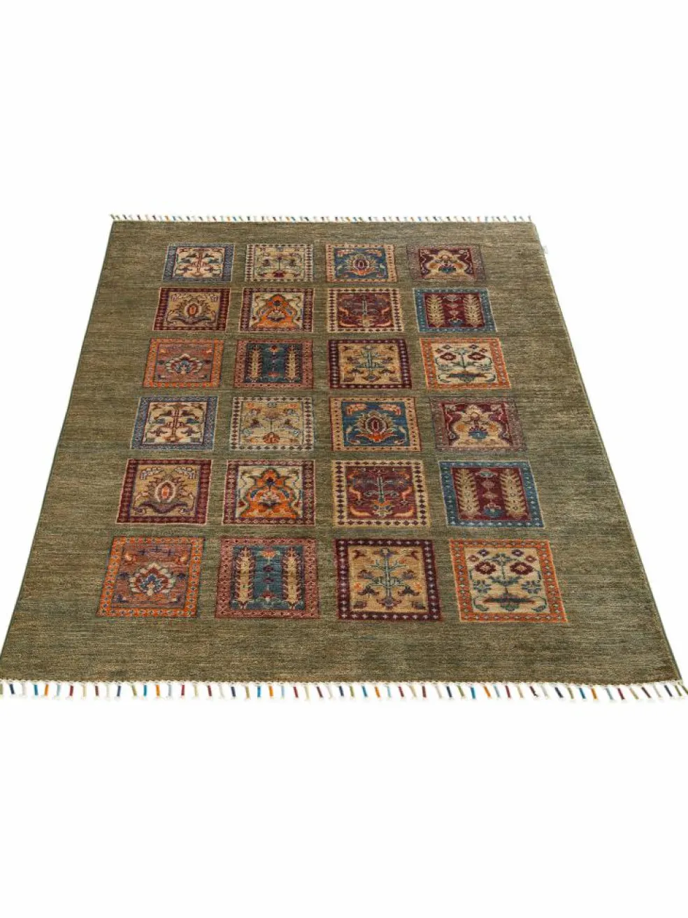 erinnert an einen üppig bewachsenen Garten mit geometrisch gegliederten, einzeln eingefassten Beeten zwischen denen die Bewässerungsgräben verlaufen. Durch den flachen und festen Flor ist der Teppich unempfindlich gegenüber den Belastungen des Alltags.- Das Besondere an diesemOrientteppich