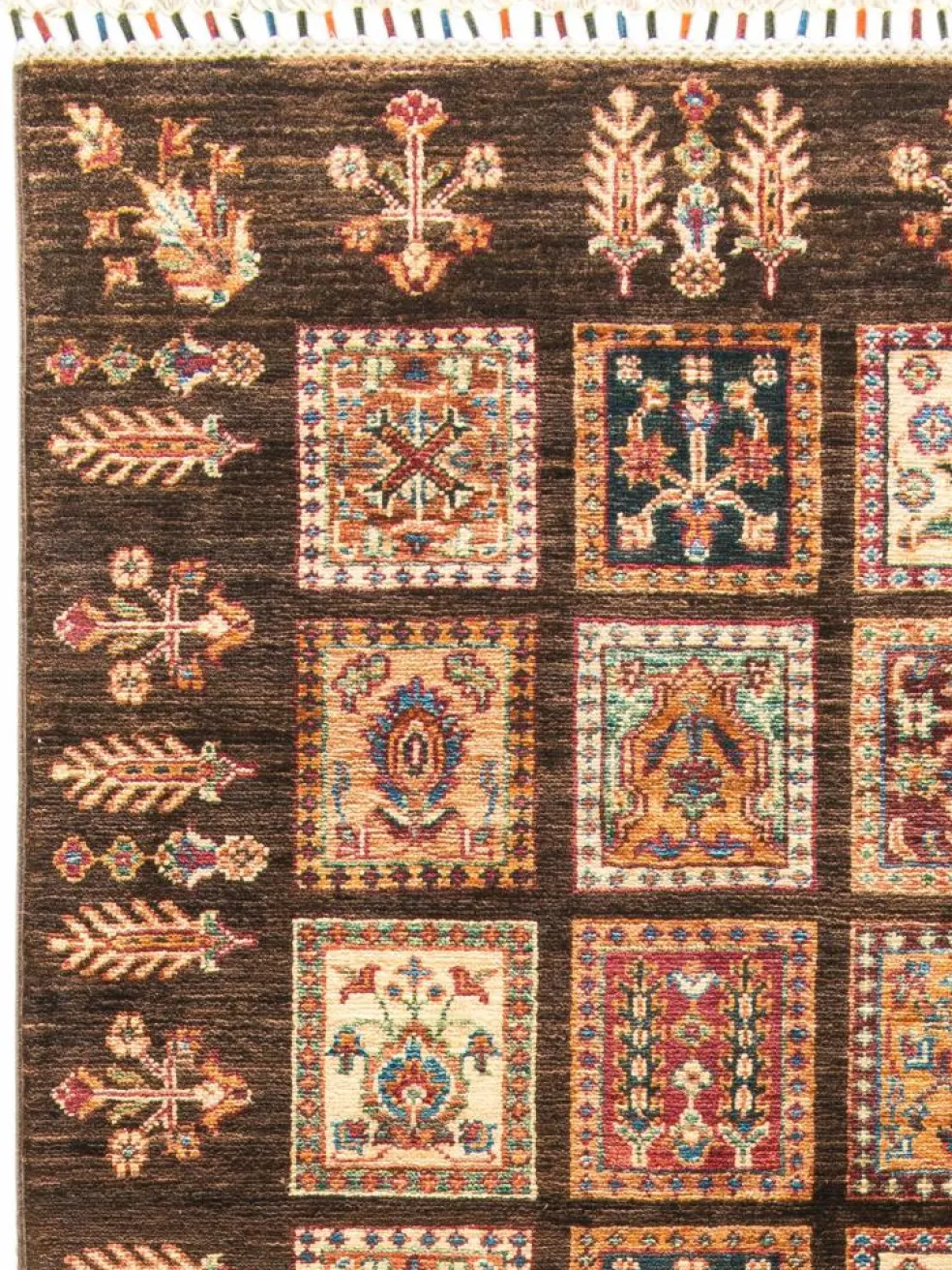mit bunten Fäden zusammen gebunden. Durch den flachen und festen Flor ist der Teppich unempfindlich gegenüber den Belastungen des Alltags.| Gesamthöhe: | ca. 6 mm |