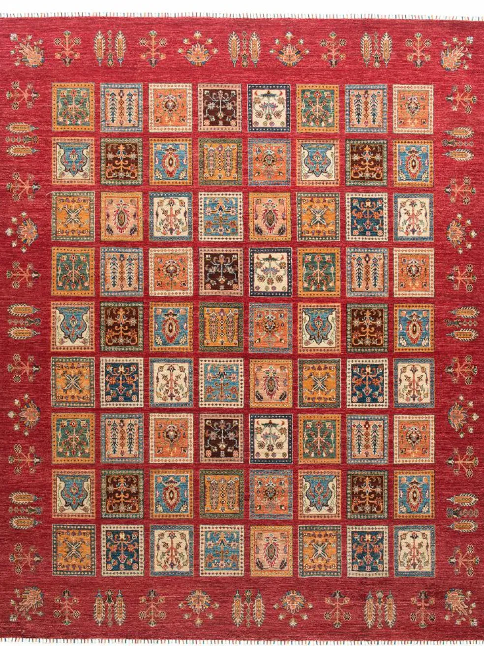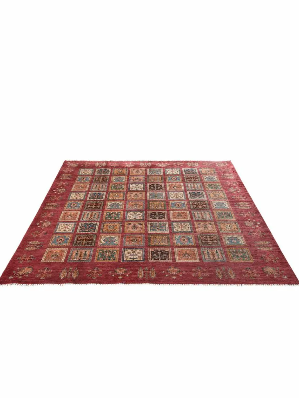erinnert an einen üppig bewachsenen Garten mit geometrisch gegliederten, einzeln eingefassten Beeten zwischen denen die Bewässerungsgräben verlaufen. Durch den flachen und festen Flor ist der Teppich unempfindlich gegenüber den Belastungen des Alltags.- Das Besondere an diesemOrientteppich