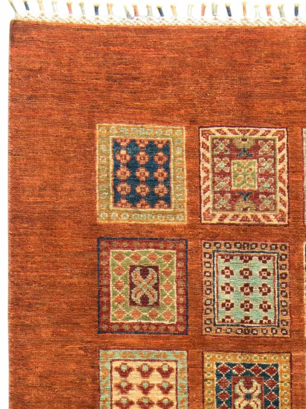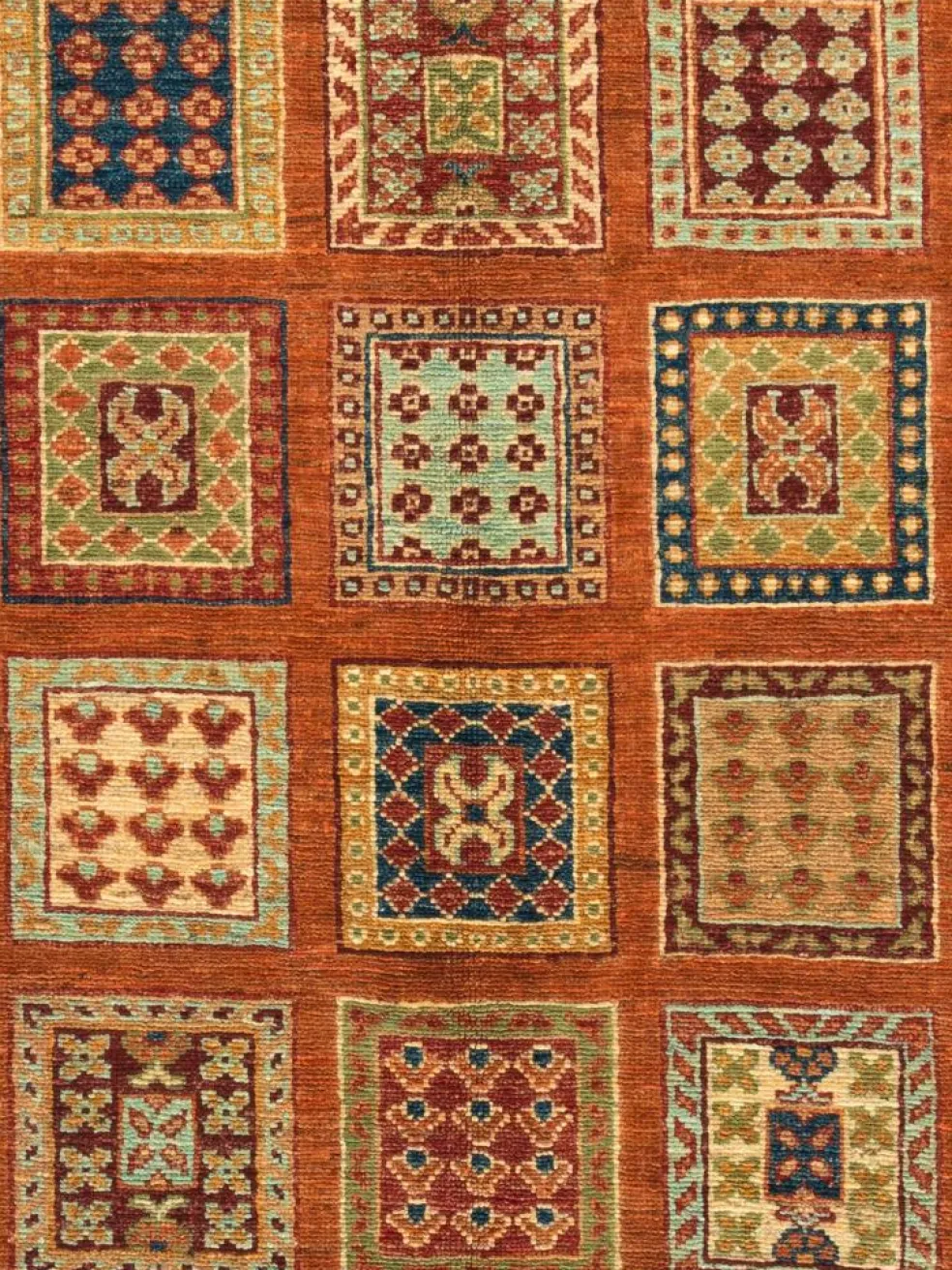 erinnert an einen üppig bewachsenen Garten mit geometrisch gegliederten, einzeln eingefassten Beeten zwischen denen die Bewässerungsgräben verlaufen. Durch den flachen und festen Flor ist der Teppich unempfindlich gegenüber den Belastungen des Alltags.- Das Besondere an diesemOrientteppich