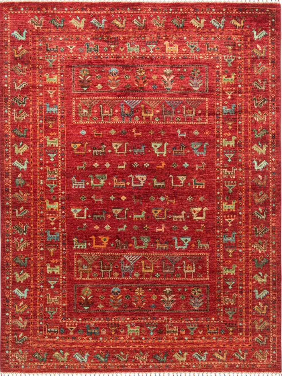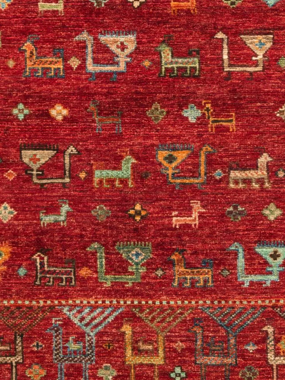 -Muster sind bunte Längsstreifen mit vielen verschiedenen Motiven gefüllt. Durch den flachen und festen Flor ist der Teppich unempfindlich gegenüber den Belastungen des Alltags.- Das Besondere an diesemOrientteppich