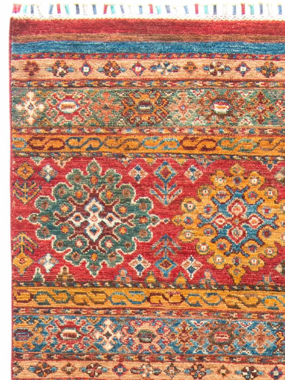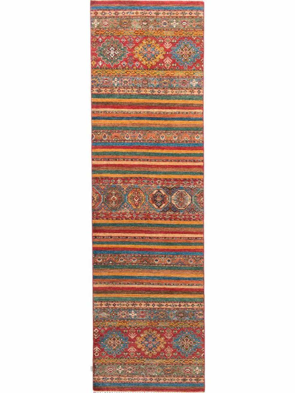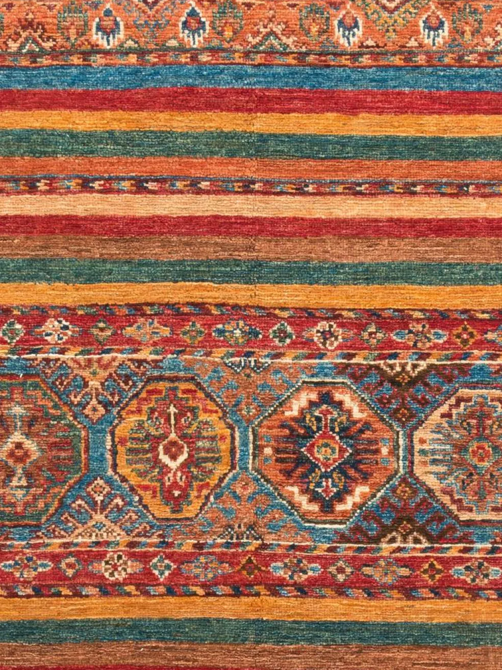 -Muster sind bunte Längsstreifen mit vielen verschiedenen Motiven gefüllt. Durch den flachen und festen Flor ist der Teppich unempfindlich gegenüber den Belastungen des Alltags.- Das Besondere an diesemOrientteppich