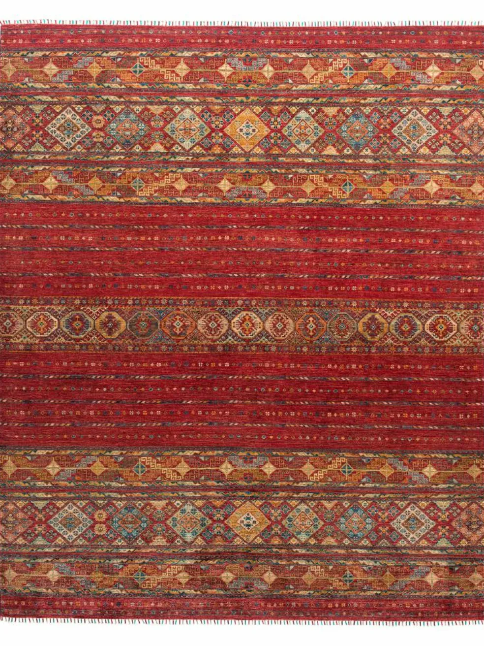 -Muster sind bunte Längsstreifen mit vielen verschiedenen Motiven gefüllt. Durch den flachen und festen Flor ist der Teppich unempfindlich gegenüber den Belastungen des Alltags.- Das Besondere an diesemOrientteppich
