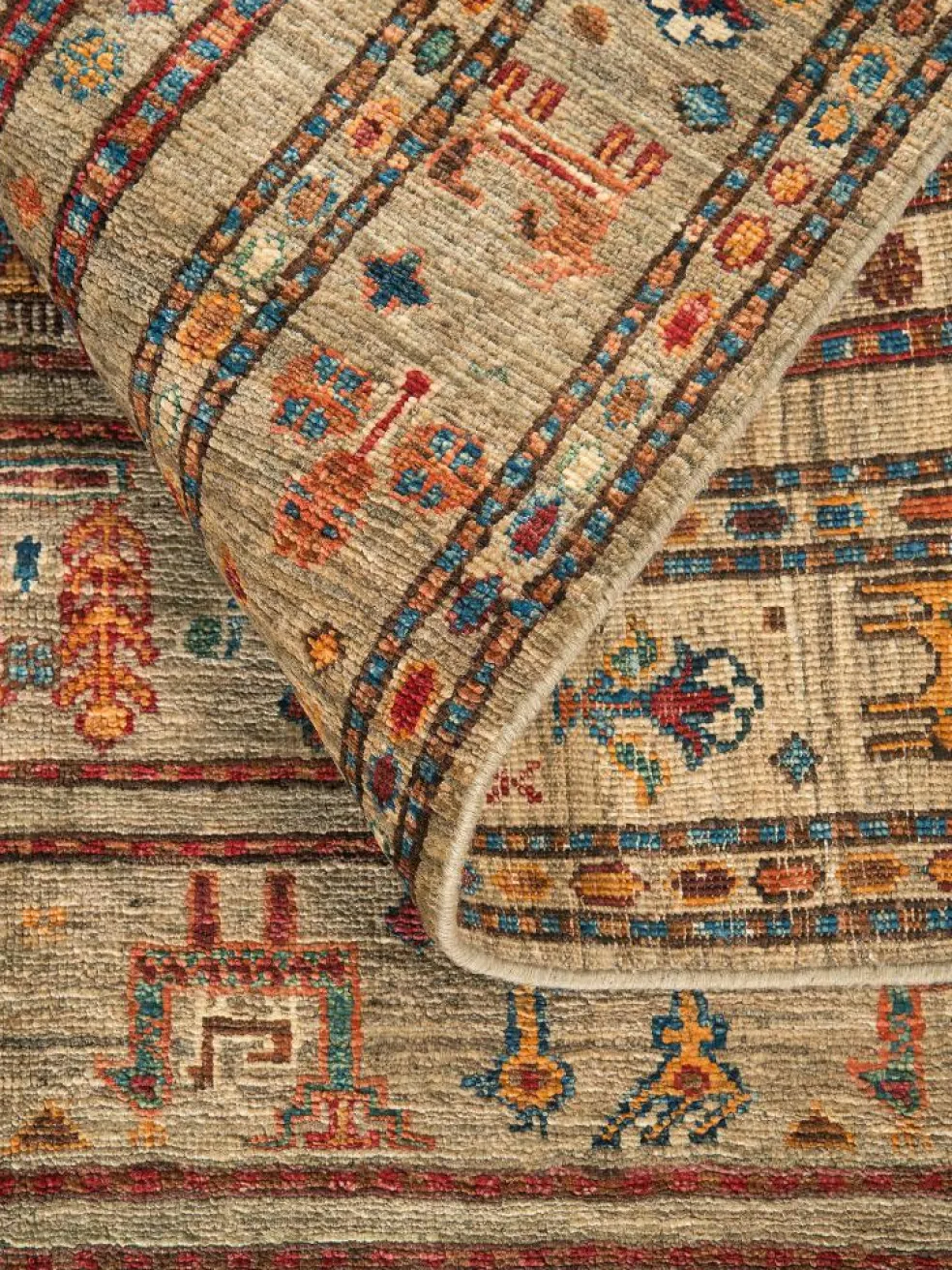 -Muster sind bunte Längsstreifen mit vielen verschiedenen Motiven gefüllt. Durch den flachen und festen Flor ist der Teppich unempfindlich gegenüber den Belastungen des Alltags.- Das Besondere an diesemOrientteppich