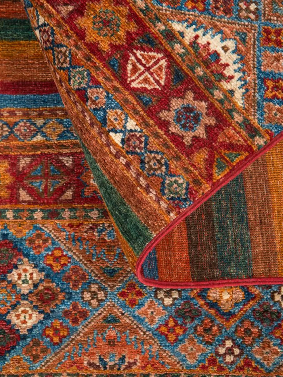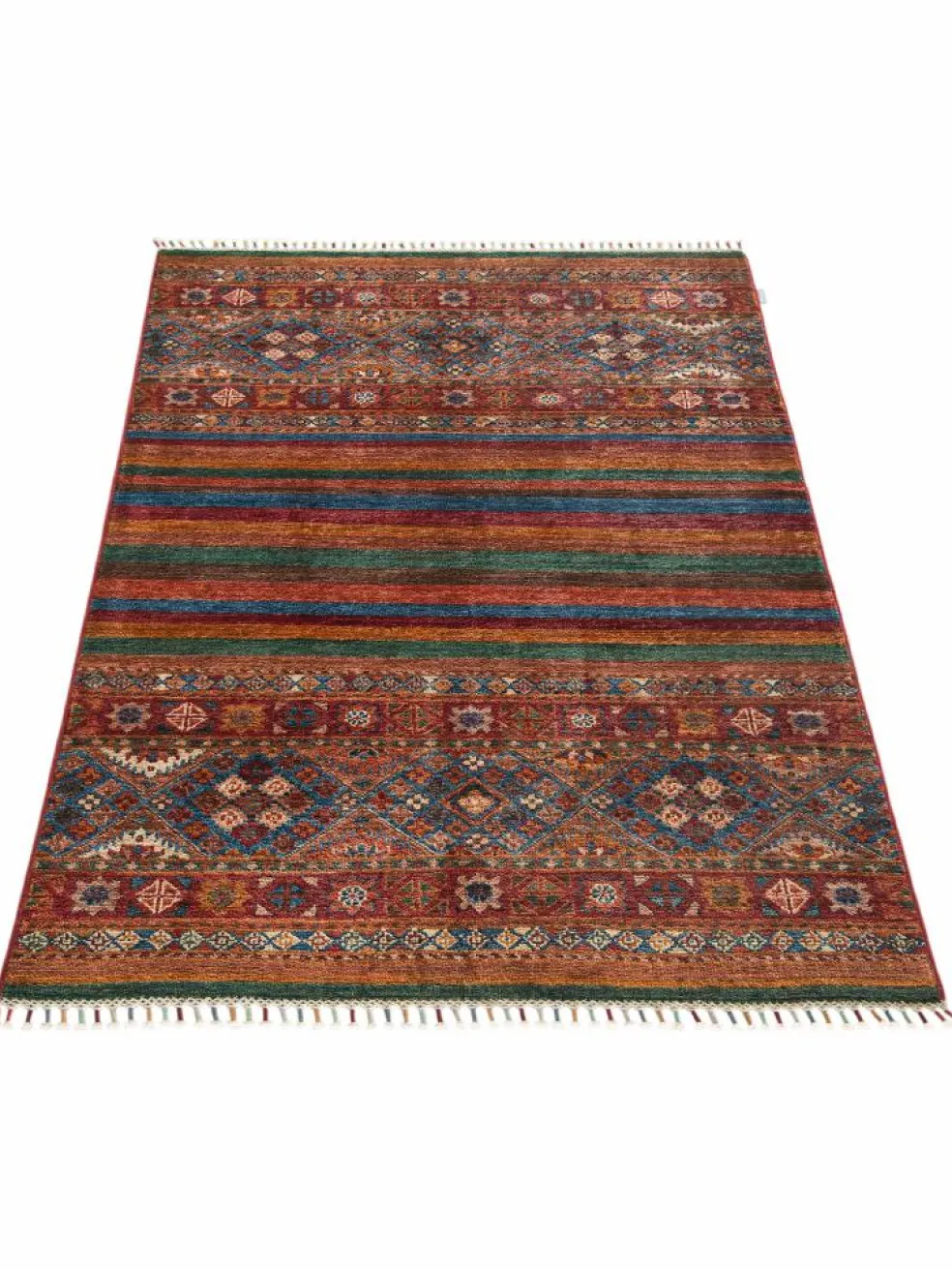 -Muster sind bunte Längsstreifen mit vielen verschiedenen Motiven gefüllt. Durch den flachen und festen Flor ist der Teppich unempfindlich gegenüber den Belastungen des Alltags.- Das Besondere an diesemOrientteppich