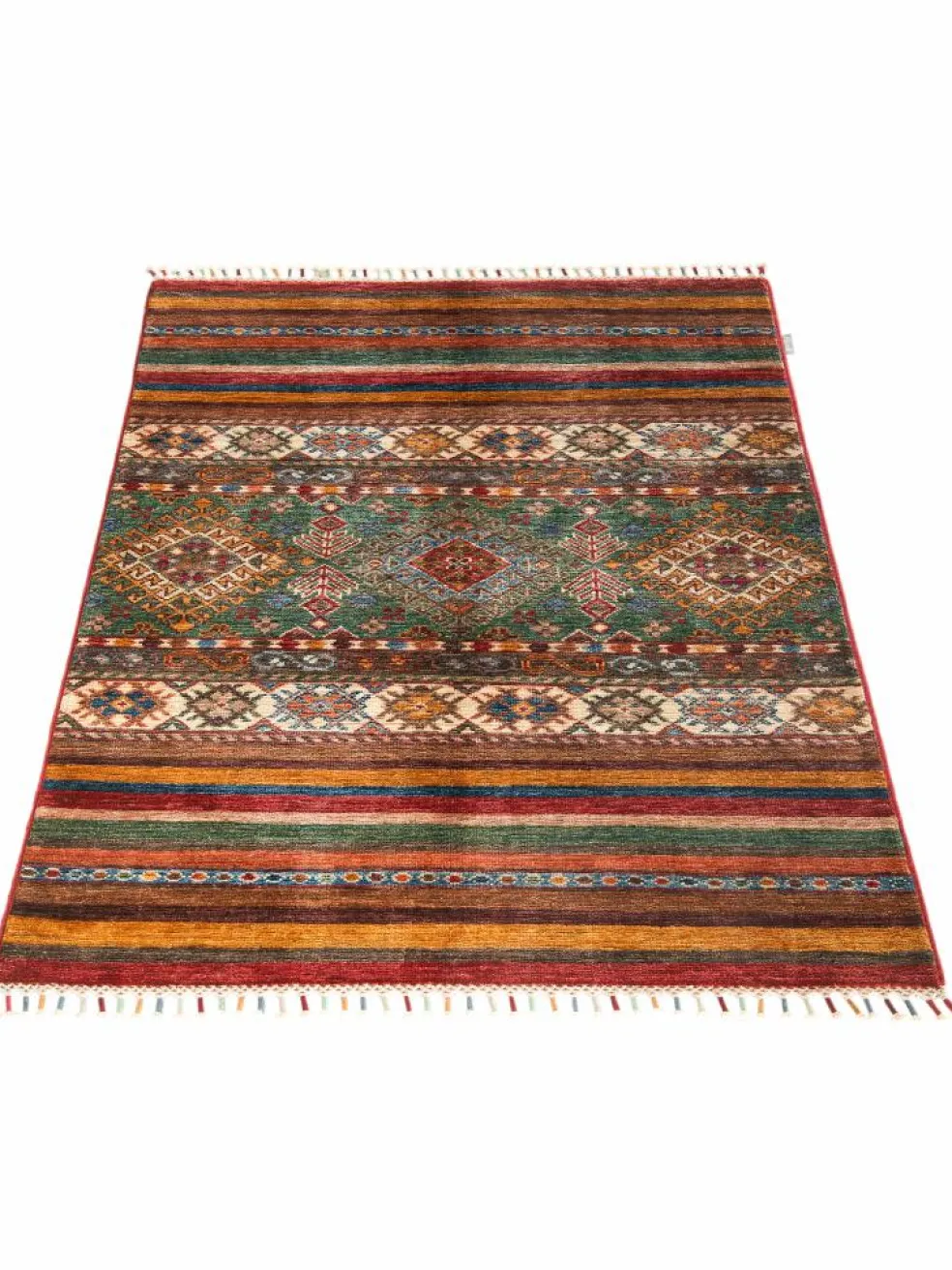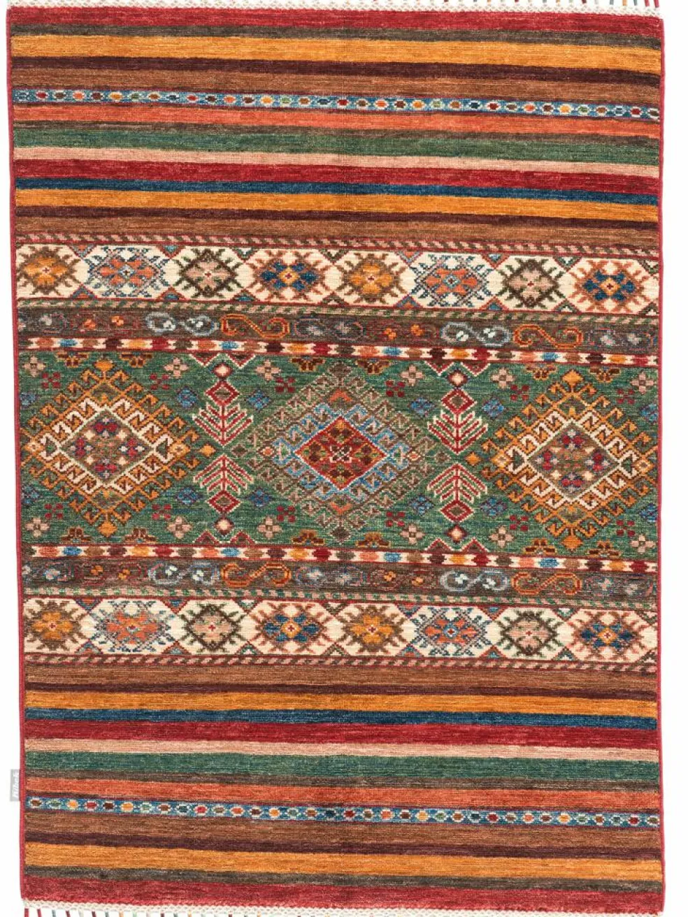 -Muster sind bunte Längsstreifen mit vielen verschiedenen Motiven gefüllt. Durch den flachen und festen Flor ist der Teppich unempfindlich gegenüber den Belastungen des Alltags.- Das Besondere an diesemOrientteppich