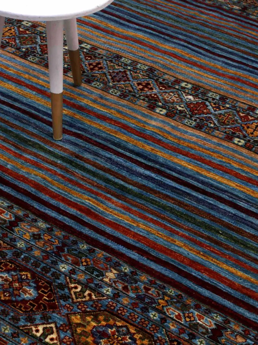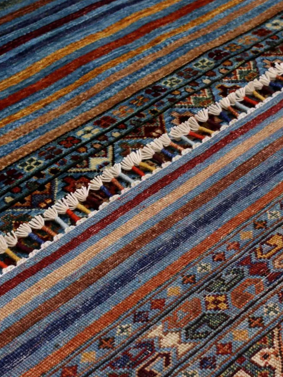 -Muster sind bunte Längsstreifen mit vielen verschiedenen Motiven gefüllt. Durch den flachen und festen Flor ist der Teppich unempfindlich gegenüber den Belastungen des Alltags. – Das Besondere an diesemOrientteppich