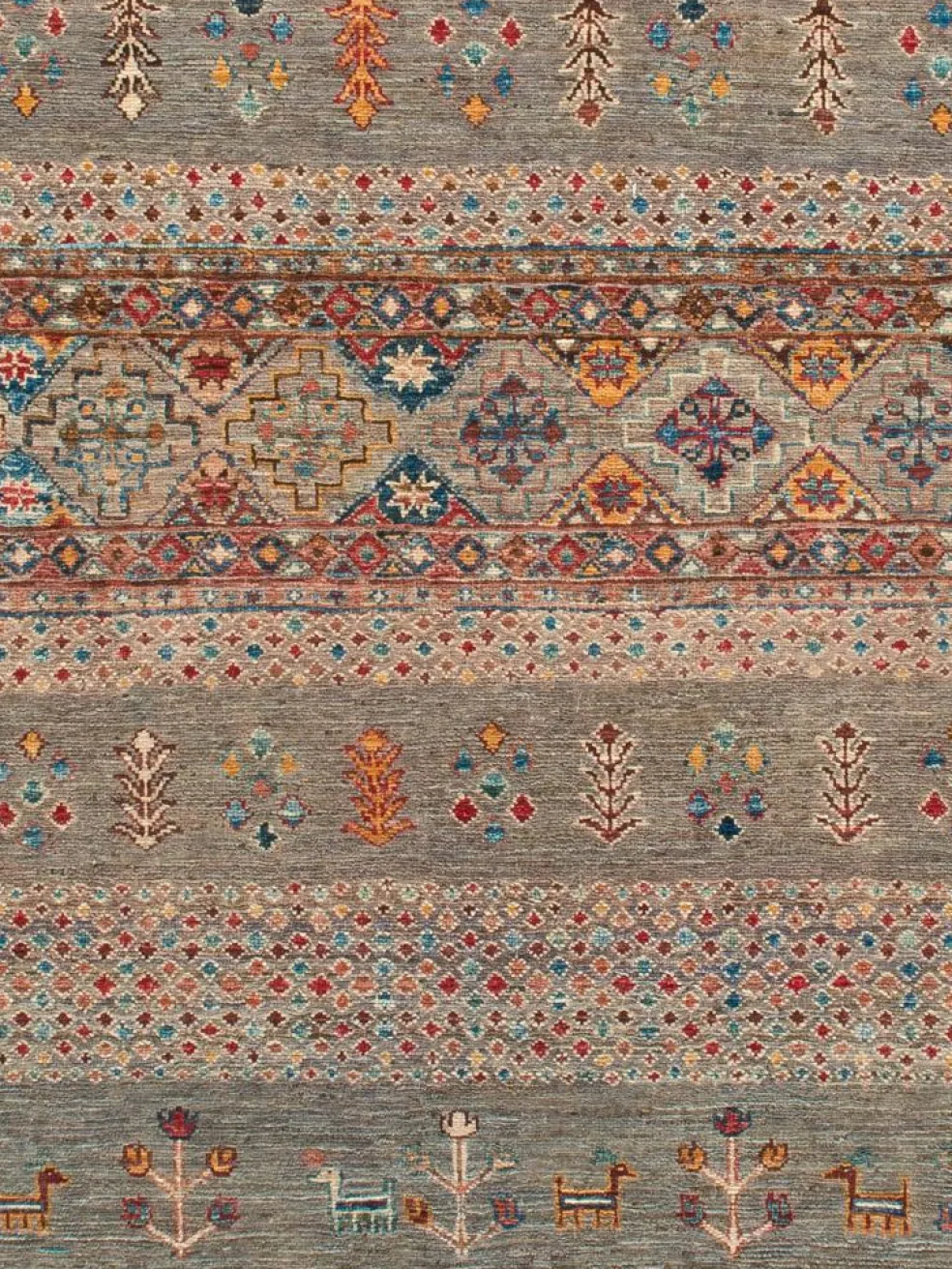 -Muster sind bunte Längsstreifen mit vielen verschiedenen Motiven gefüllt. Durch den flachen und festen Flor ist der Teppich unempfindlich gegenüber den Belastungen des Alltags.- Das Besondere an diesemOrientteppich