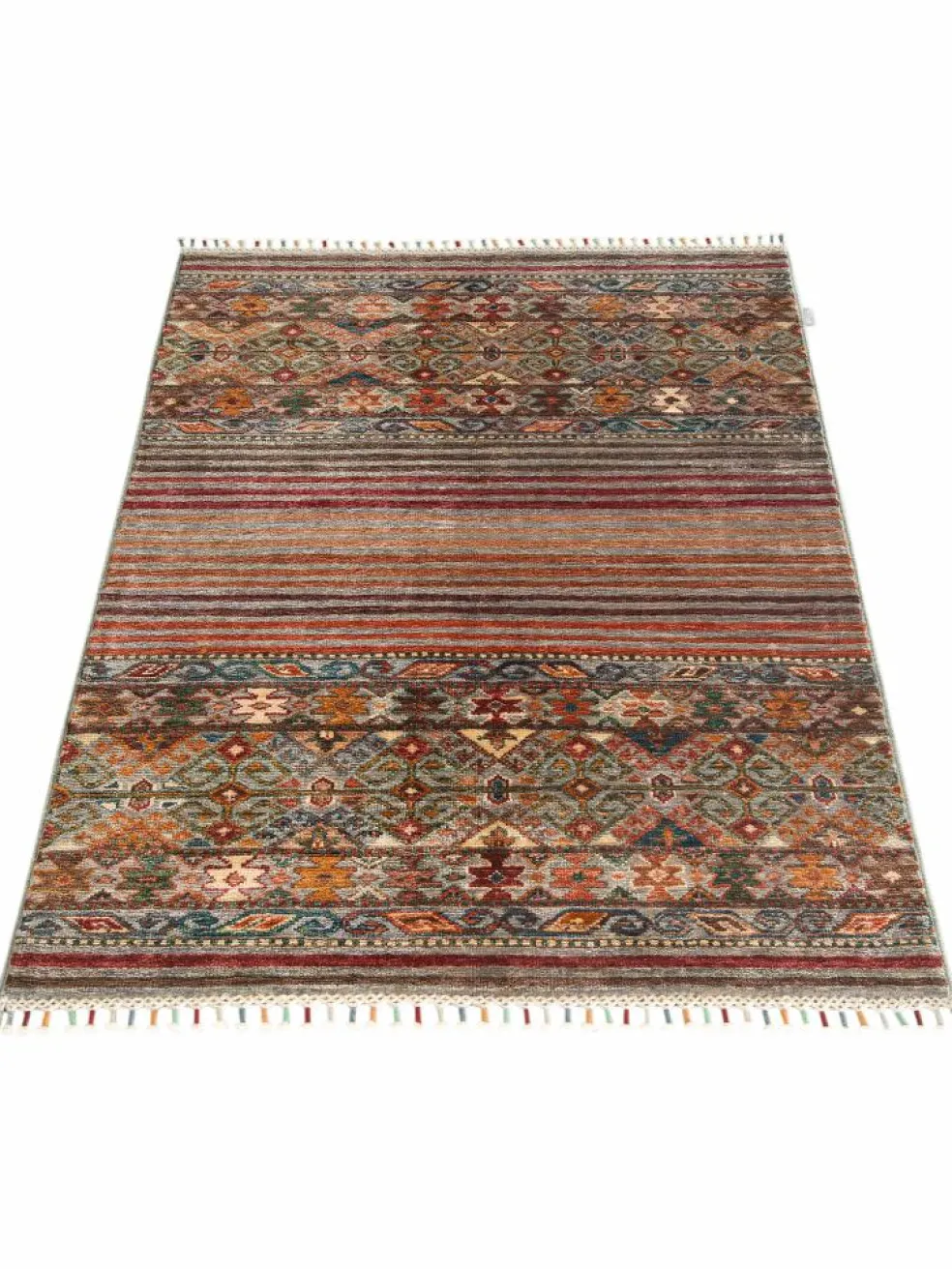-Muster sind bunte Längsstreifen mit vielen verschiedenen Motiven gefüllt. Durch den flachen und festen Flor ist der Teppich unempfindlich gegenüber den Belastungen des Alltags.- Das Besondere an diesemOrientteppich
