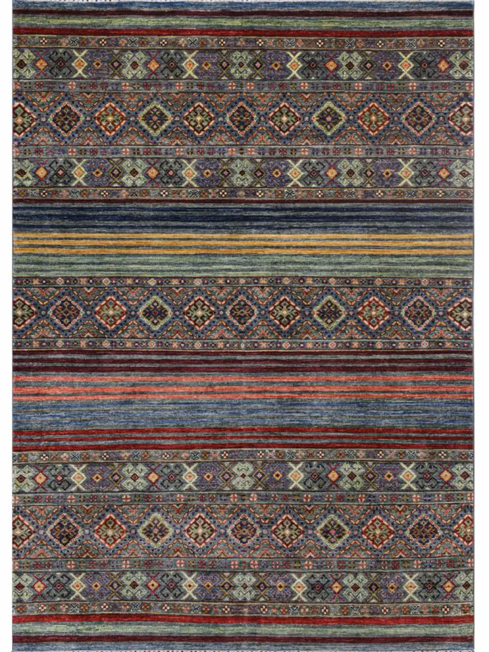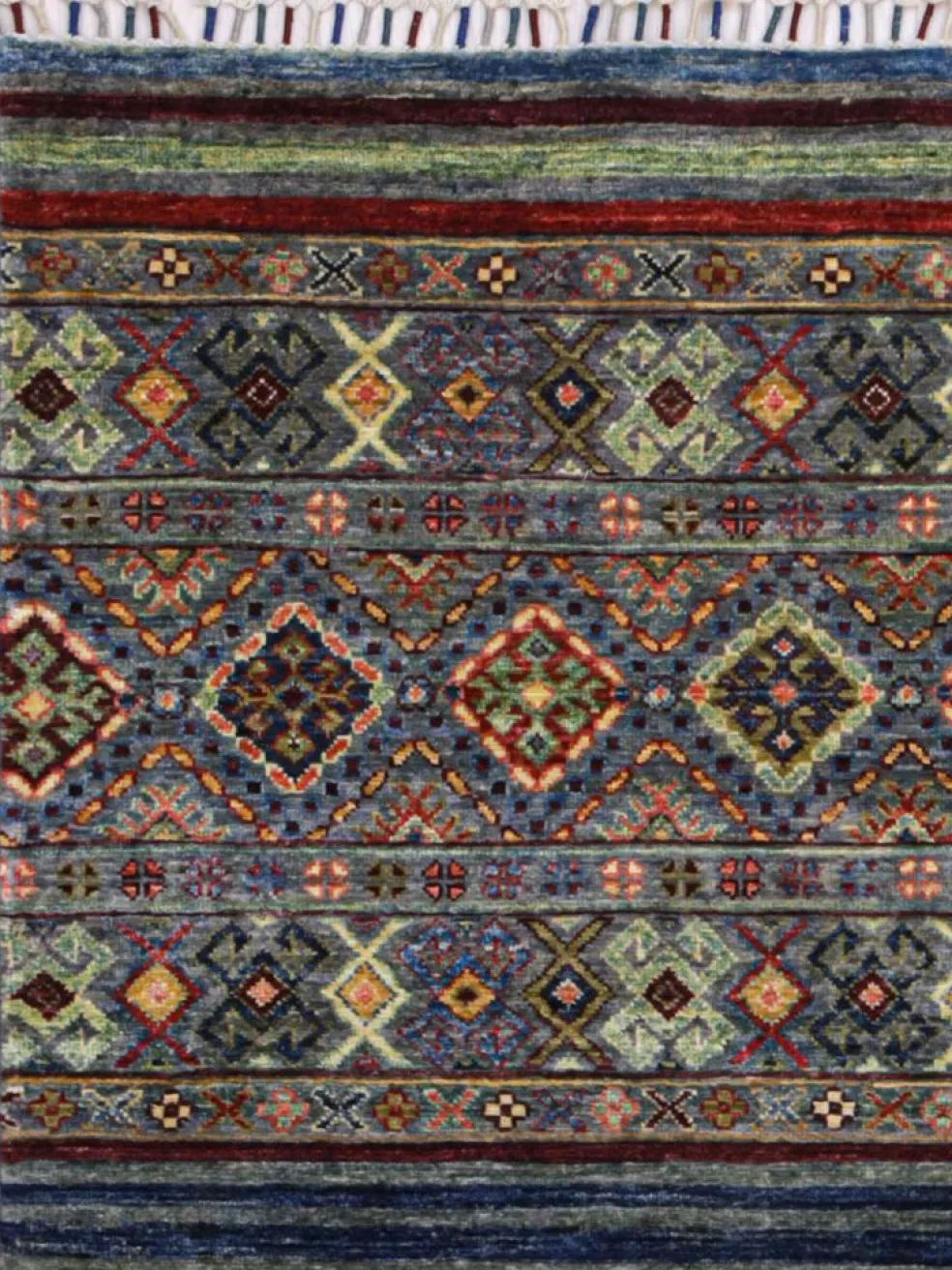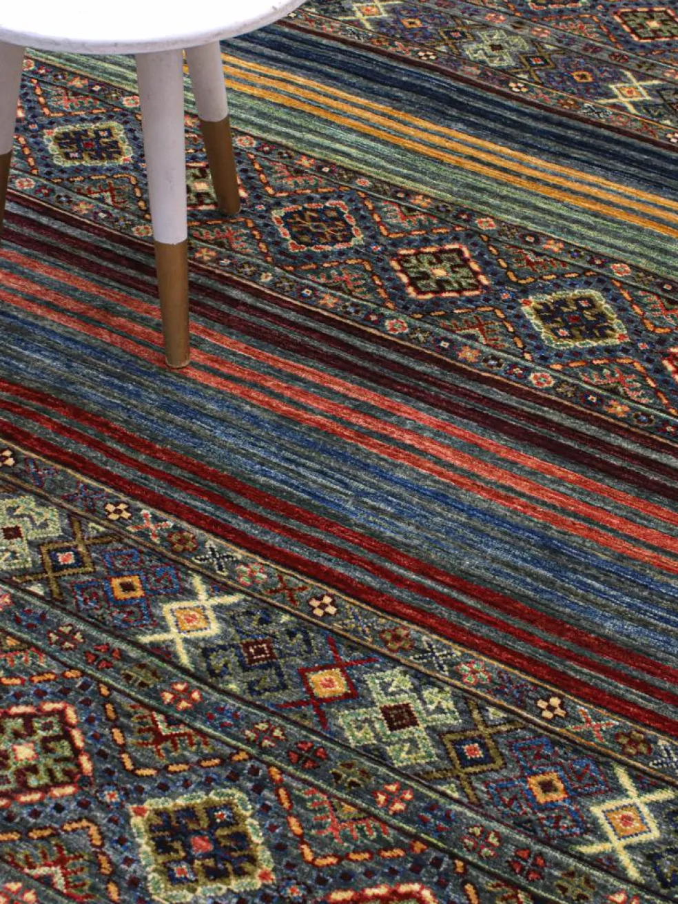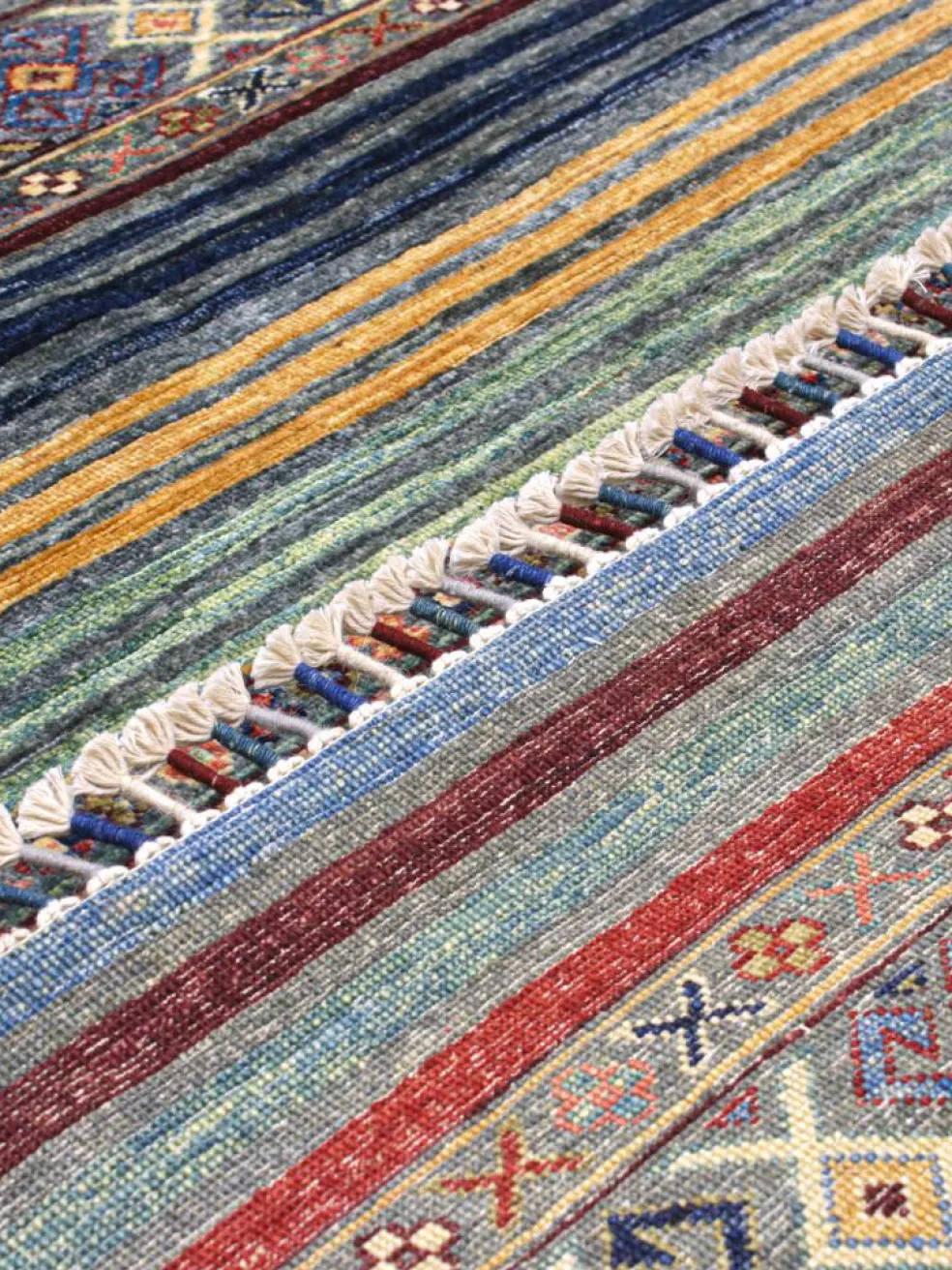 -Muster sind bunte Längsstreifen mit vielen verschiedenen Motiven gefüllt. Durch den flachen und festen Flor ist der Teppich unempfindlich gegenüber den Belastungen des Alltags. – Das Besondere an diesemOrientteppich