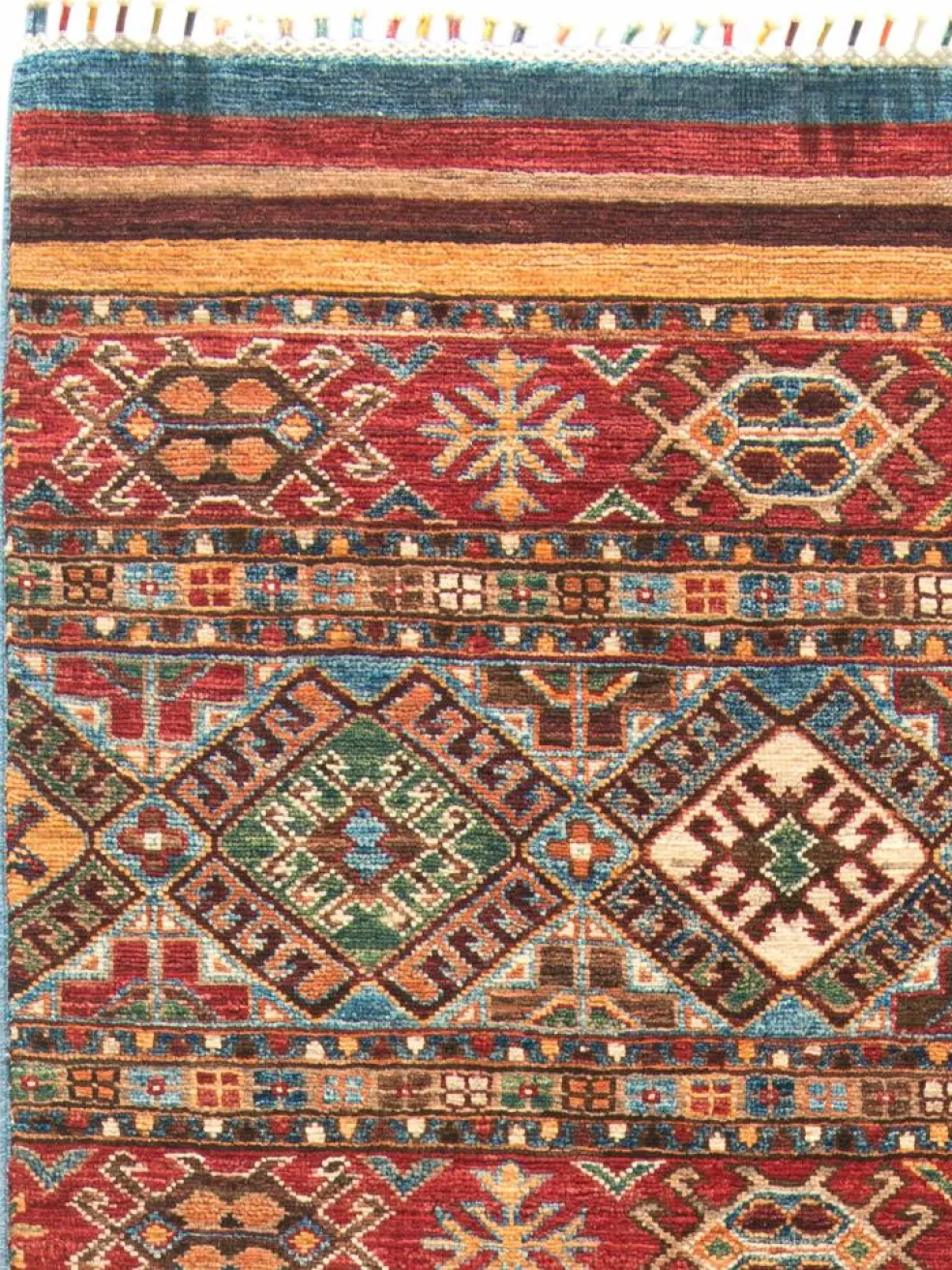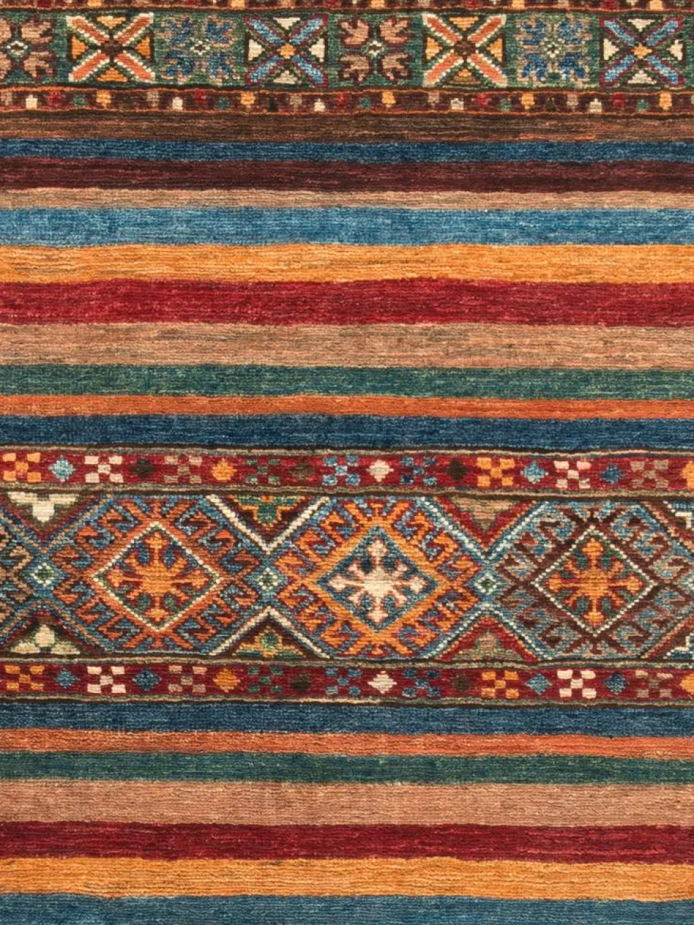 -Muster sind bunte Längsstreifen mit vielen verschiedenen Motiven gefüllt. Durch den flachen und festen Flor ist der Teppich unempfindlich gegenüber den Belastungen des Alltags.- Das Besondere an diesemOrientteppich